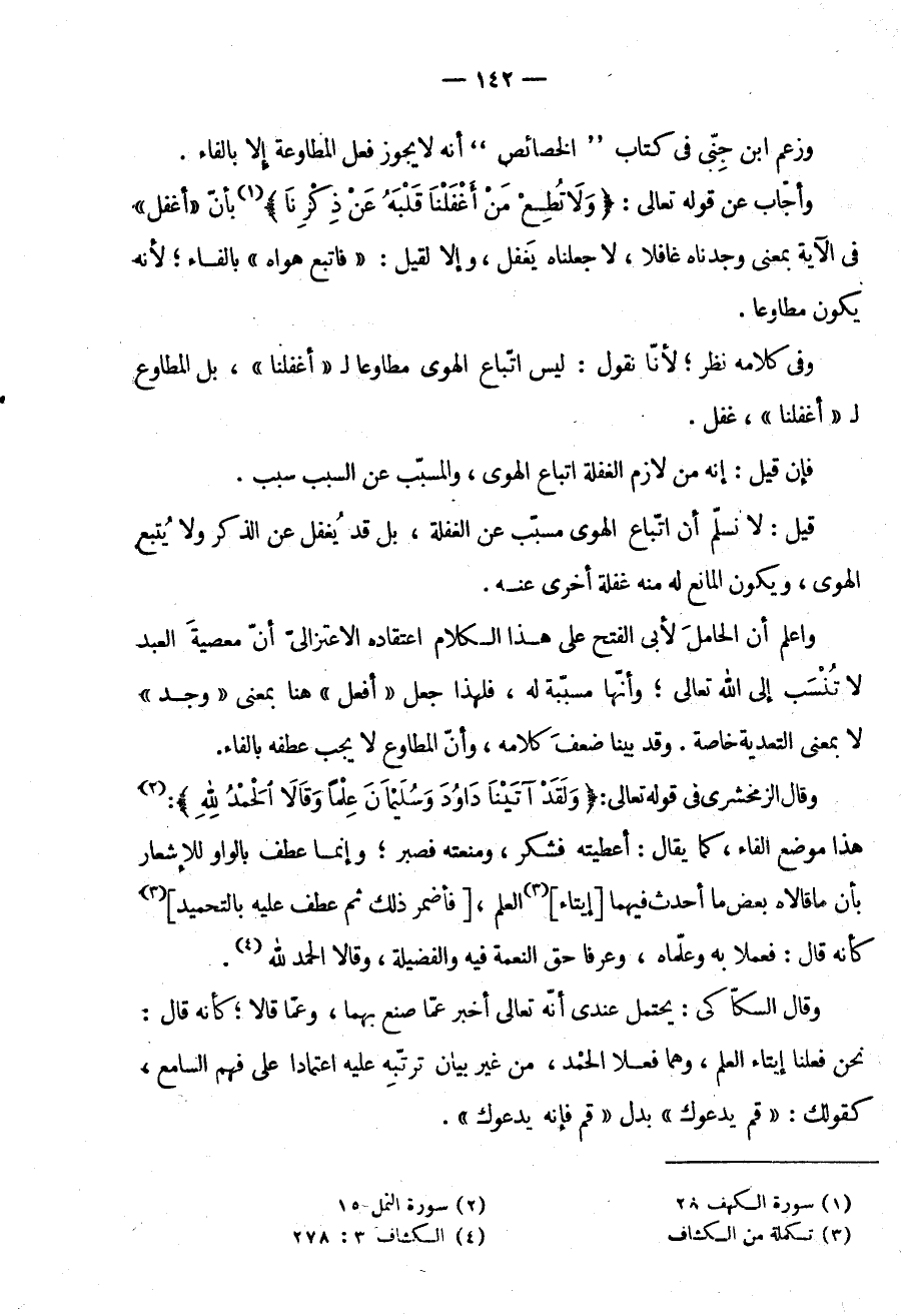 وَأَجَابَ عَنْ قَوْلِهِ تَعَالَى: {وَلَا تُطِعْ مَنْ أَغْفَلْنَا قلبه عن ذكرنا} ،بِأَنَّ أَغْفَلَ فِي الْآيَةِ بِمَعْنَى وَجَدْنَاهُ غَافِلًا لَا جَعَلْنَاهُ يَغْفُلُ وَإِلَّا لَقِيلَ فَاتَّبَعَ هَوَاهُ بِالْفَاءِ لِأَنَّهُ يَكُونُ مُطَاوِعًا