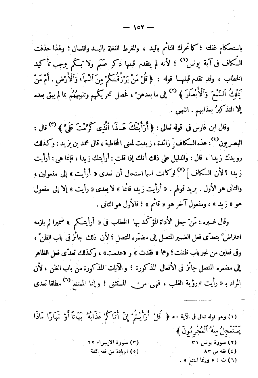 وَقَالَ غَيْرُهُ: مَنْ جَعَلَ الْأَدَاةَ الْمُؤَكَّدَ بِهَا الْخِطَابُ فِي أرأيتكم ضمير لَمْ يَلْزَمْهُ اعْتِرَاضٌ بِتَعَدِّي فِعْلِ الضَّمِيرِ الْمُتَّصِلِ إِلَى مُضْمَرِهِ الْمُتَّصِلِ لِأَنَّ ذَلِكَ جَائِزٌ فِي بَابِ الظَّنِّ وَفِي فِعْلَيْنِ مِنْ غَيْرِ بَابِ ظننت وهما فقدت وعدمت وَكَذَلِكَ تَعَدِّي فِعْلِ الظَّاهِرِ إِلَى مُضْمَرِهِ الْمُتَّصِلِ جَائِزٌ فِي الْأَفْعَالِ الْمَذْكُورَةِ وَالْآيَاتِ الْمَذْكُورَةِ مِنْ بَابِ الظَّنِّ لِأَنَّ الْمُرَادَ بِـ "رَأَيْتُ" رُؤْيَةَ الْقَلْبِ فَهِيَ مِنَ الْمُسْتَثْنَى وَإِنَّمَا الْمُمْتَنِعُ مُطْلَقًا تعدي