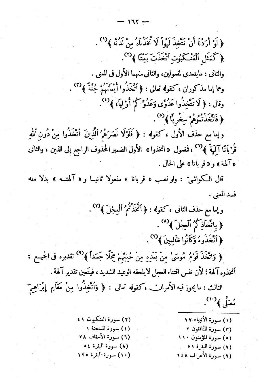 {وَاتَّخَذَ قَوْمُ مُوسَى مِنْ بَعْدِهِ مِنْ حُلِيِّهِمْ عجلا جسدا} ، تَقْدِيرُهُ فِي الْجَمِيعِ اتَّخَذُوهُ آلِهَةً لِأَنَّ نَفْسَ اقْتِنَاءِ الْعِجْلِ لَا يَلْحَقُهُ الْوَعِيدُ الشَّدِيدُ فَيَتَعَيَّنُ تقدير آلهة