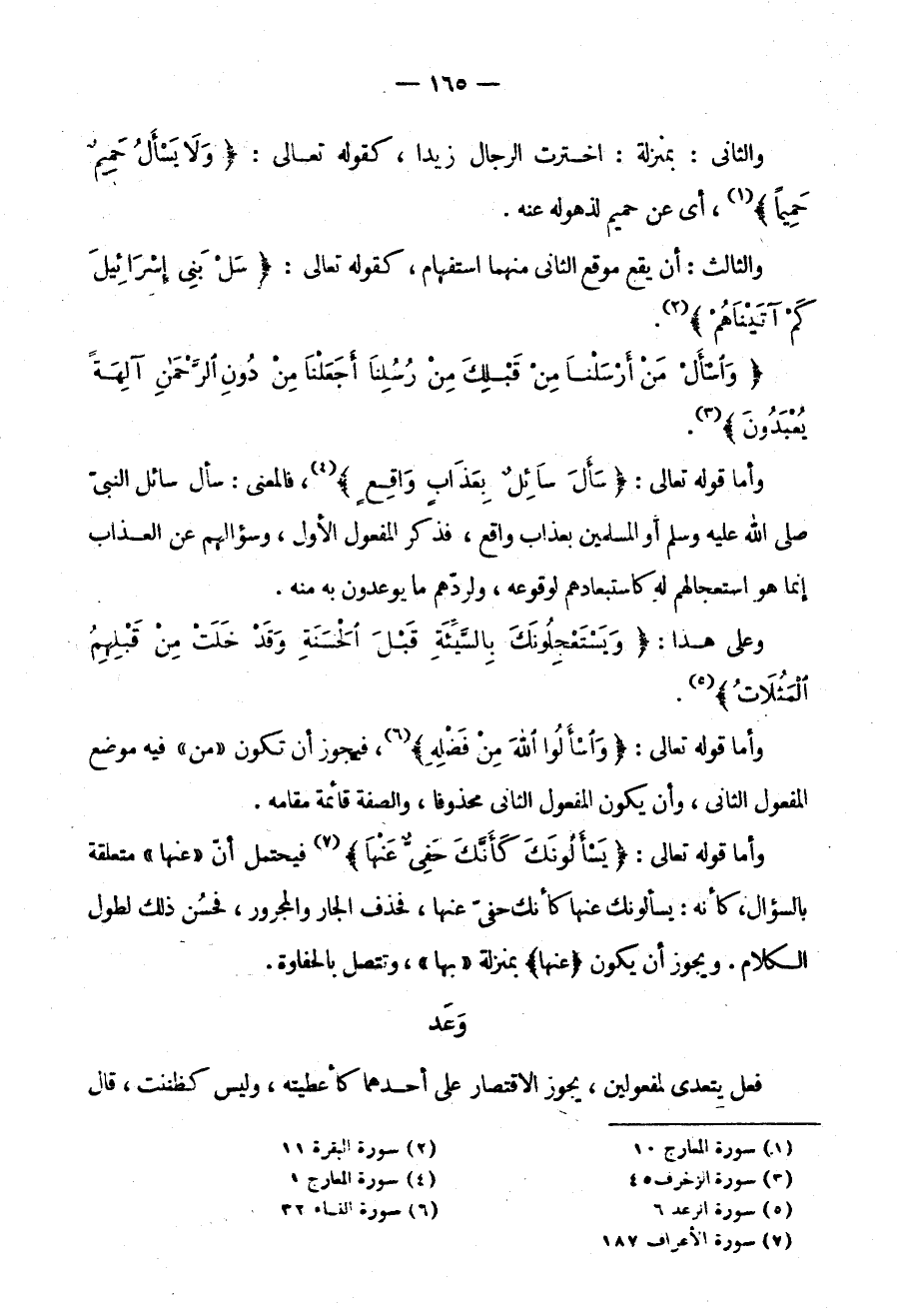 وَأَمَّا قَوْلُهُ تَعَالَى: {سَأَلَ سَائِلٌ بِعَذَابٍ وَاقِعٍ} ، فالمعنىسأل: سَائِلٌ النَّبِيَّ صَلَّى اللَّهُ عَلَيْهِ وَسَلَّمَ أَوِ الْمُسْلِمِينَ بِعَذَابٍ وَاقِعٍ فَذَكَرَ الْمَفْعُولَ الْأَوَّلَ وَسُؤَالُهُمْ عَنِ الْعَذَابِ إِنَّمَا هُوَ اسْتِعْجَالُهُمْ لَهُ كَاسْتِبْعَادِهِمْ لِوُقُوعِهِ وَلِرَدِّهِمْ مَا يُوعَدُونَ بِهِ مِنْهُ