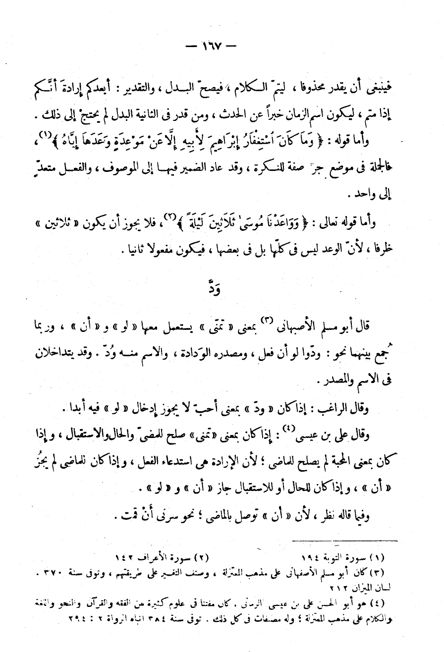 وَقَالَ عَلِيُّ بْنُ عِيسَى، إذا كان بمعنى تمنى صلح للمضي وَالْحَالِ وَالِاسْتِقْبَالِ وَإِذَا كَانَ بِمَعْنَى الْمَحَبَّةِ لَمْ يَصْلُحْ لِلْمَاضِي لِأَنَّ الْإِرَادَةَ هِيَ اسْتِدْعَاءُ الْفِعْلِ وَإِذَا كَانَ لِلْمَاضِي لَمْ يَجُزْ "أَنْ" وَإِذَا كَانَ لِلْحَالِ أَوْ لِلِاسْتِقْبَالِ جَازَ "أَنْ" وَ"لو" وفيما قاله نظرا لِأَنَّ "أَنْ" تُوصَلُ بِالْمَاضِي نَحْوُ سَرَّنِي أَنْ قمت