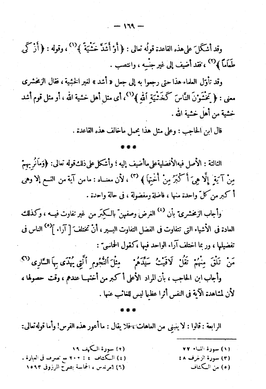 وَأَجَابَ الزَّمَخْشَرِيُّ بِأَنَّ الْغَرَضَ وَصْفُهُنَّ بِالْكِبَرِ مِنْ غَيْرِ تَفَاوُتٍ فِيهِ وَكَذَلِكَ الْعَادَةُ فِي الْأَشْيَاءِ الَّتِي تَتَفَاوَتُ فِي الْفَضْلِ التَّفَاوُتَ الْيَسِيرَ أَنْ تَخْتَلِفَ آرَاءُ النَّاسِ فِي تَفْضِيلِهَا وَرُبَّمَا اخْتَلَفَ آرَاءُ الْوَاحِدِ فِيهَا كَقَوْلِ الْحَمَاسِيِّ: