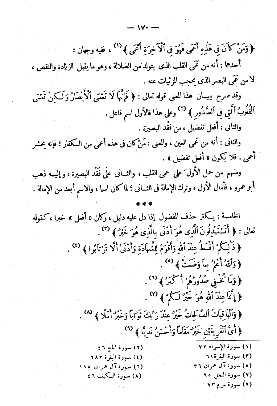 أَحَدُهُمَا: أَنَّهُ مِنْ عَمَى الْقَلْبِ الَّذِي يَتَوَلَّدُ مِنَ الضَّلَالَةِ وَهُوَ مَا يَقْبَلُ الزِّيَادَةَ وَالنَّقْصَ لَا مِنْ عَمَى الْبَصَرِ الَّذِي يَحْجُبُ الْمَرْئِيَّاتِ عَنْهُ