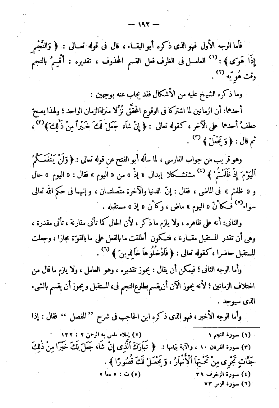 وَأَمَّا الْوَجْهُ الثَّانِي فَيُمْكِنُ أَنْ يُقَالَ يَجُوزُ تَقْدِيرُهُ وَهُوَ الْعَامِلُ وَلَا يَلْزَمُ مَا قَالَ مِنِ اخْتِلَافِ الزَّمَانَيْنِ لِأَنَّهُ يَجُوزُ الْآنَ أَنْ يقسم بطلوع النجم فِي الْمُسْتَقْبَلِ وَيَجُوزُ أَنْ يُقْسِمَ بِالشَّيْءِ الَّذِي سَيُوجَدُ