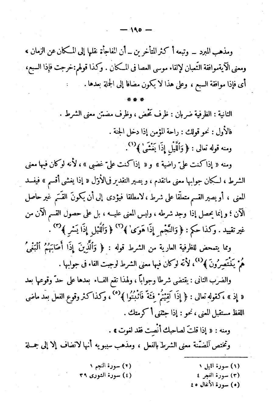 ومنه إذا كنت علي راضية وإذا كُنْتِ عَلَيَّ غَضْبَى لِأَنَّهُ لَوْ كَانَ فِيهَا مَعْنَى الشَّرْطِ لَكَانَ جَوَابُهَا مَعْنَى مَا تَقَدَّمَ ويصير التقدير الأول إذا يغشى أقسم فيفسد المعنى أَوْ يَصِيرُ الْقَسَمُ مُتَعَلِّقًا عَلَى شَرْطٍ لَا مُطْلَقًا فَيُؤَدِّي إِلَى أَنْ يَكُونَ الْقَسَمُ غَيْرَ حَاصِلٍ الْآنَ وَإِنَّمَا يَحْصُلُ إِذَا وُجِدَ شَرْطُهُ وَلَيْسَ الْمَعْنَى عَلَيْهِ بَلْ عَلَى حُصُولِ الْقَسَمِ الْآنَ مِنْ غَيْرِ تَقْيِيدٍ وَكَذَا حُكْمُ {وَالنَّجْمِ إذا هوى} {والليل إذا يسر}