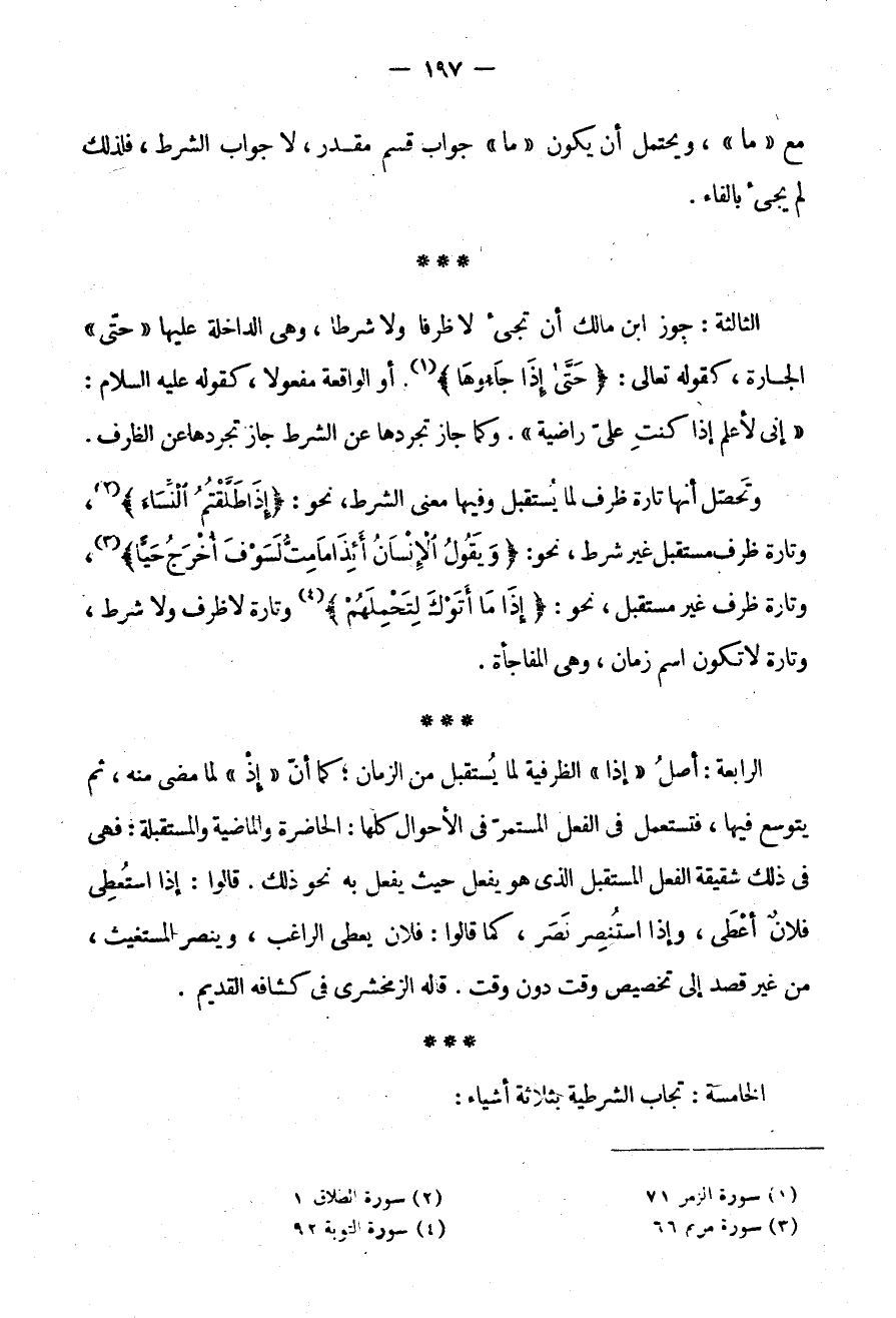 الرَّابِعَةُ: أَصْلُ إِذَا الظَّرْفِيَّةِ لِمَا يُسْتَقْبَلُ مِنَ الزَّمَانِ كَمَا أَنَّ إِذْ لِمَا مَضَى مِنْهُ ثُمَّ يُتَوَسَّعُ فِيهَا فَتُسْتَعْمَلُ فِي الْفِعْلِ الْمُسْتَمِرِّ فِي الْأَحْوَالِ كُلِّهَا الْحَاضِرَةِ وَالْمَاضِيَةِ وَالْمُسْتَقْبَلَةِ فَهِيَ فِي ذَلِكَ شَقِيقَةُ الْفِعْلِ الْمُسْتَقْبَلِ الَّذِي هُوَ يُفْعَلُ حَيْثُ يُفْعَلُ بِهِ نَحْوُ ذَلِكَ قَالُوا إِذَا اسْتُعْطِيَ فُلَانٌ أَعْطَى وَإِذَا اسْتُنْصِرَ نَصَرَ كَمَا قَالُوا فُلَانٌ يُعْطِي الرَّاغِبَ وَيَنْصُرُ الْمُسْتَغِيثَ مِنْ غَيْرِ قصد إلى تخصيص وقت دون وقت قال الزَّمَخْشَرِيُّ فِي كَشَّافِهِ الْقَدِيمِ