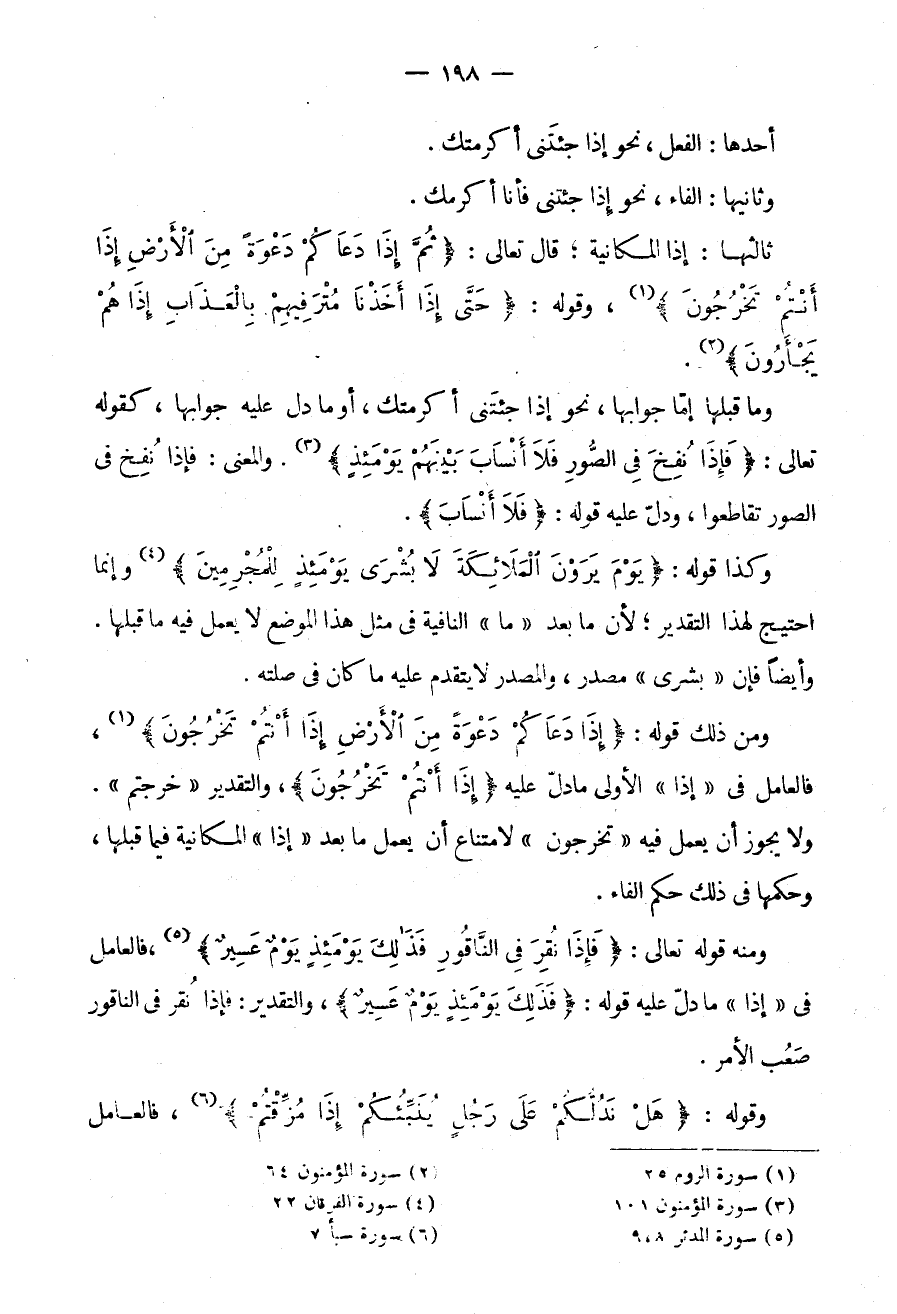 وَمَا قَبْلَهَا إِمَّا جَوَابُهَا نَحْوُ إِذَا جِئْتَنِي أَكْرَمْتُكَ أَوْ مَا دَلَّ عَلَيْهِ جَوَابُهَا كَقَوْلِهِ تَعَالَى: {فَإِذَا نُفِخَ فِي الصُّورِ فَلَا أَنْسَابَ بينهم يومئذ} وَالْمَعْنَى فَإِذَا نُفِخَ فِي الصُّورِ تَقَاطَعُوا وَدَلَّ عليه قوله: {فلا أنساب}