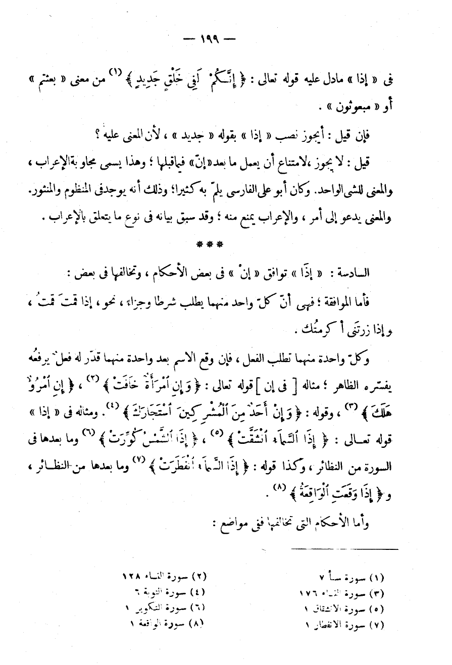 وَكُلَّ وَاحِدَةٍ مِنْهُمَا تَطْلُبُ الْفِعْلَ فَإِنْ وَقَعَ الِاسْمُ بَعْدَ وَاحِدَةٍ مِنْهُمَا قُدِّرَ لَهُ فِعْلٌ يَرْفَعُهُ يُفَسِّرُهُ الظَّاهِرُ مِثَالُهُ فِي إِنَّ قَوْلُهُ تَعَالَى: {وإن امرأة خافت} {إن امرؤ هلك} وقوله: {وإن أحد من المشركين استجارك} وَمِثَالُهُ فِي إِذَا قَوْلُهُ تَعَالَى: {إِذَا السَّمَاءُ انشقت} و {إذا الشمس كورت} وَمَا بَعْدَهَا فِي السُّورَةِ مِنَ النَّظَائِرِ وَكَذَا قوله: {إذا السماء انفطرت} وَمَا بَعْدَهَا مِنَ النَّظَائِرِ وَ {إِذَا وَقَعَتِ الْوَاقِعَةِ} وَأَمَّا الْأَحْكَامُ الَّتِي تُخَالِفُهَا فَفِي مَوَاضِعَ: