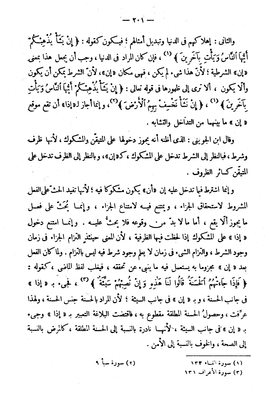 وَإِنَّمَا اشْتُرِطَ فِيمَا تَدْخُلُ عَلَيْهِ إِنْ أَنْ يَكُونَ مَشْكُوكًا فِيهِ لِأَنَّهَا تُفِيدُ الْحَثَّ عَلَى الْفِعْلِ الْمَشْرُوطِ لِاسْتِحْقَاقِ الْجَزَاءِ وَيَمْتَنِعُ فِيهِ لِامْتِنَاعِ الْجَزَاءِ وَإِنَّمَا يُحَثُّ عَلَى فِعْلِ مَا يَجُوزُ أَلَّا يقع أما ما لابد مِنْ وُقُوعِهِ فَلَا يُحَثُّ عَلَيْهِ وَإِنَّمَا امْتَنَعَ دُخُولُ إِذَا عَلَى الْمَشْكُوكِ إِذَا لُحِظَتْ فِيهَا الظَّرْفِيَّةُ لِأَنَّ الْمَعْنَى حِينَئِذٍ الْتِزَامُ الْجَزَاءِ فِي زَمَانِ وُجُودِ الشَّرْطِ وَالْتِزَامُ الشَّيْءِ فِي زَمَانٍ لَا يُعْلَمُ وُجُودُ شَرْطٍ فِيهِ لَيْسَ بِالْتِزَامٍ وَلَمَّا كَانَ الْفِعْلُ بَعْدَ إِنْ مَجْزُومًا بِهِ يُسْتَعْمَلُ فِيهِ مَا يُنْبِئُ عَنْ تَحَقُّقِهِ فَيَغْلِبُ لَفْظُ الْمَاضِي كَقَوْلِهِ: {فَإِذَا جَاءَتْهُمُ الْحَسَنَةُ قَالُوا لَنَا هَذِهِ وَإِنْ تصبهم سيئة} فَجِيءَ بِـ "إِذَا" فِي جَانِبِ الْحَسَنَةِ وَبِـ "إِنْ" فِي جَانِبِ السَّيِّئَةِ لِأَنَّ الْمُرَادَ بِالْحَسَنَةِ جِنْسُ الْحَسَنَةِ وَلِهَذَا عُرِّفَتْ وَحُصُولُ الْحَسَنَةِ الْمُطْلَقَةِ مَقْطُوعٌ بِهِ فَاقْتَضَتِ الْبَلَاغَةُ التَّعْبِيرَ بِـ "إِذَا" وَجِيءَ بِـ "إِنْ" فِي جَانِبِ السَّيِّئَةِ لِأَنَّهَا نَادِرَةٌ بِالنِّسْبَةِ إِلَى الْحَسَنَةِ الْمُطْلَقَةِ كَالْمَرَضِ بِالنِّسْبَةِ إِلَى الصِّحَّةِ وَالْخَوْفِ بِالنِّسْبَةِ إِلَى الْأَمْنِ