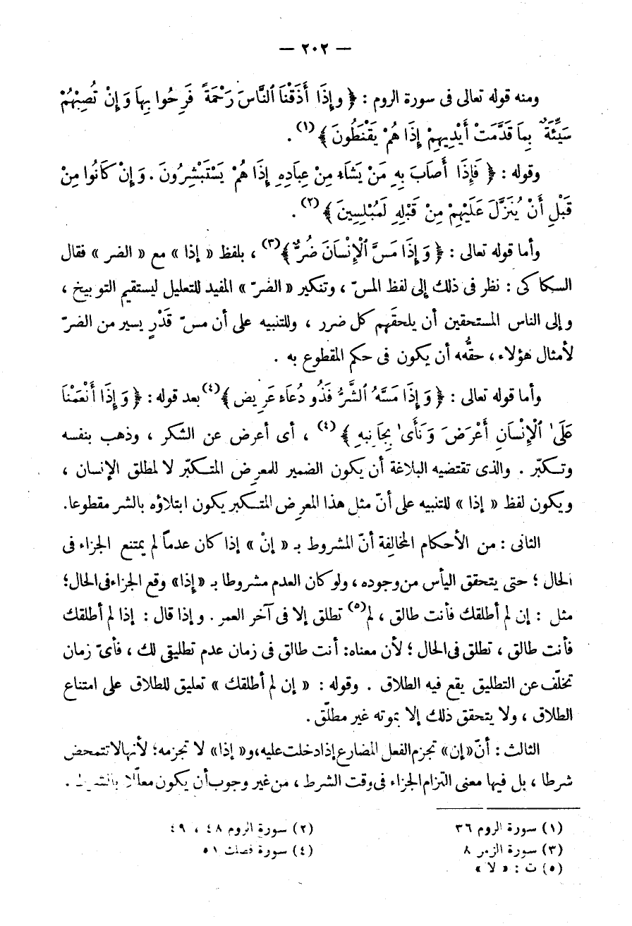 وَمِنْهُ قَوْلُهُ تَعَالَى فِي سُورَةِ الرُّومِ: {وَإِذَا أَذَقْنَا النَّاسَ رَحْمَةً فَرِحُوا بِهَا وَإِنْ تُصِبْهُمْ سَيِّئَةٌ بِمَا قَدَّمَتْ أَيْدِيهِمْ إِذَا هُمْ يَقْنَطُونَ} وَقَوْلُهُ: {فَإِذَا أَصَابَ بِهِ مَنْ يَشَاءُ مِنْ عِبَادِهِ إِذَا هُمْ يَسْتَبْشِرُونَ وَإِنْ كَانُوا مِنْ قَبْلِ أَنْ يُنَزَّلَ عَلَيْهِمْ مِنْ قَبْلِهِ لَمُبْلِسِينَ} وَأَمَّا قَوْلُهُ تَعَالَى: {وَإِذَا مَسَّ الْإِنْسَانَ ضُرٌّ} بِلَفْظِ إِذَا مَعَ الضُّرِّ فَقَالَ السَّكَّاكِيُّ نُظِرَ فِي ذَلِكَ إِلَى لَفْظِ الْمَسِّ وَتَنْكِيرِ الضُّرِّ الْمُفِيدِ لِلتَّعْلِيلِ لِيَسْتَقِيمَ التَّوْبِيخُ وَإِلَى النَّاسِ الْمُسْتَحِقِّينَ أَنْ يَلْحَقَهُمْ كُلُّ ضَرَرٍ وَلِلتَّنْبِيهِ عَلَى أَنَّ مَسَّ قَدْرٍ يَسِيرٍ مِنَ الضُّرِّ لِأَمْثَالِ هَؤُلَاءِ حَقُّهُ أَنْ يَكُونَ فِي حُكْمِ الْمَقْطُوعِ بِهِ