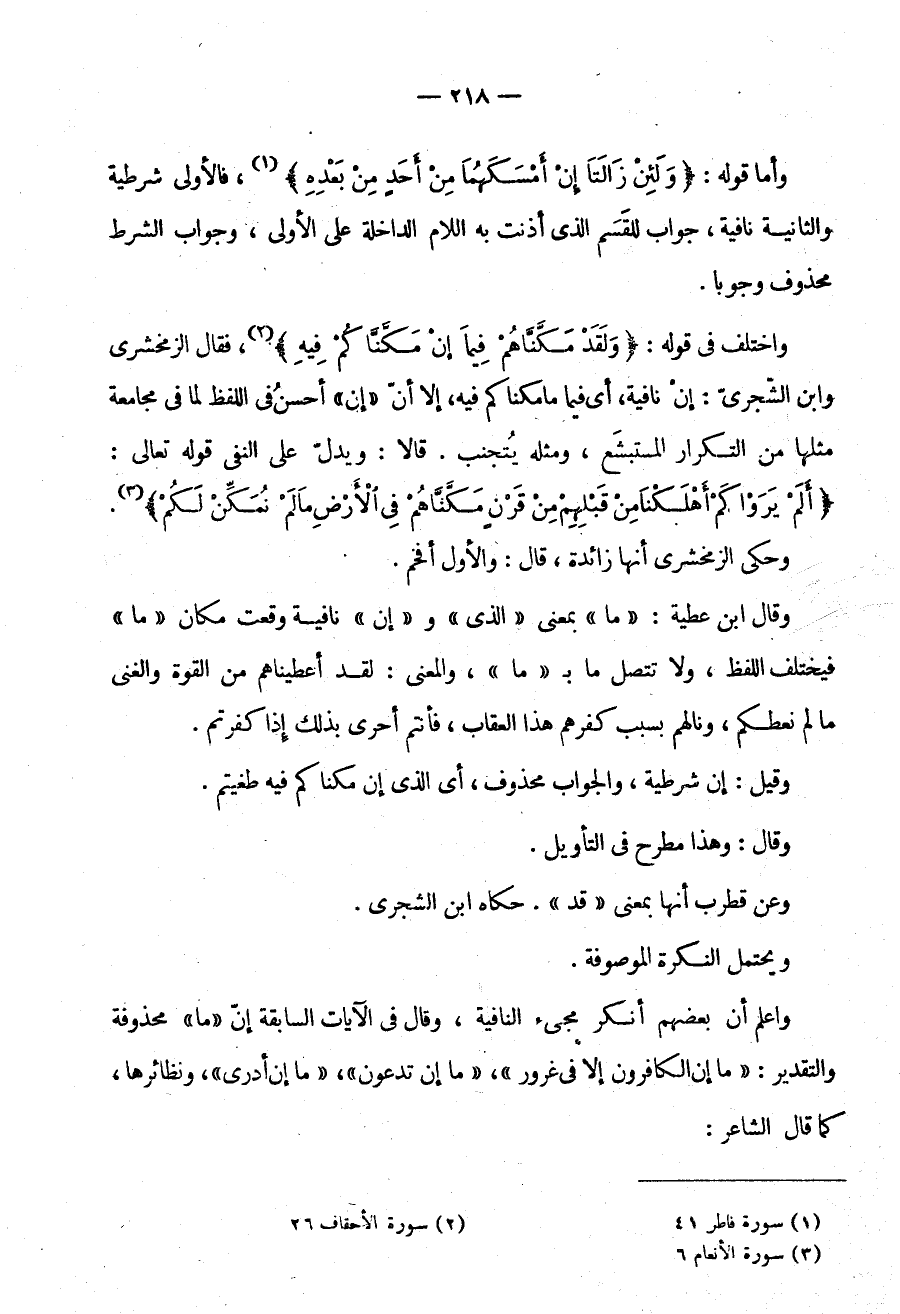وَاخْتُلِفَ فِي قَوْلِهِ: {وَلَقَدْ مكناهم فيما إن مكناكم فيه} فَقَالَ الزَّمَخْشَرِيُّ وَابْنُ الشَّجَرِيِّ إِنْ نَافِيَةٌ أَيْ فِيمَا مَا مَكَّنَّاكُمْ فِيهِ إِلَّا أَنَّ إِنْ أَحْسَنُ فِي اللَّفْظِ لِمَا فِي مُجَامَعَةِ مِثْلِهَا مِنَ التَّكْرَارِ الْمُسْتَبْشَعِ وَمِثْلُهُ يُتَجَنَّبُ قَالَا وَيَدُلُّ عَلَى النَّفْيِ قَوْلُهُ تَعَالَى: {أَلَمْ يَرَوْا كَمْ أَهْلَكْنَا مِنْ قَبْلِهِمْ مِنْ قَرْنٍ مَكَّنَّاهُمْ فِي الأرض ما لم نمكن لكم} وَحَكَى الزَّمَخْشَرِيُّ أَنَّهَا زَائِدَةٌ قَالَ وَالْأَوَّلُ أَفْخَمُ