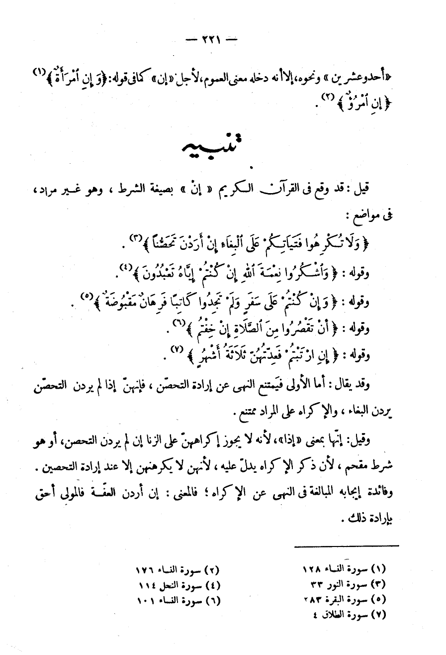 وَقِيلَ: إِنَّهَا بِمَعْنَى إِذَا لِأَنَّهُ لَا يَجُوزُ إِكْرَاهُهُنَّ عَلَى الزِّنَا إِنْ لَمْ يُرِدْنَ التَّحَصُّنَ أَوْ هُوَ شَرْطٌ مُقْحَمٌ لِأَنَّ ذِكْرَ الْإِكْرَاهِ يَدُلُّ عَلَيْهِ لِأَنَّهُنَّ لَا يُكْرِهْنَهُنَّ إِلَّا عِنْدَ إِرَادَةِ التَّحْصِينِ وَفَائِدَةُ إِيجَابِهِ الْمُبَالَغَةُ فِي النَّهْيِ عَنِ الْإِكْرَاهِ فَالْمَعْنَى إِنْ أَرَدْنَ الْعِفَّةَ فَالْمَوْلَى أَحَقُّ بإرادة ذلك.