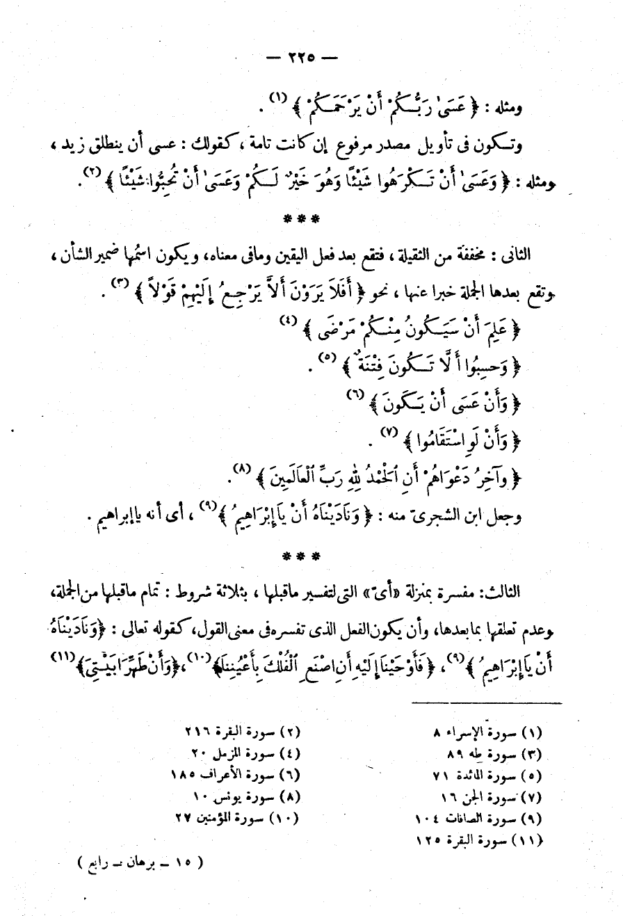 الثَّانِي: مُخَفَّفَةً مِنَ الثَّقِيلَةِ فَتَقَعُ بَعْدَ فِعْلِ الْيَقِينِ وَمَا فِي مَعْنَاهُ وَيَكُونُ اسْمُهَا ضَمِيرَ الشَّأْنِ وَتَقَعُ بَعْدَهَا الْجُمْلَةُ خَبَرًا عَنْهَا نَحْوُ: {أفلا يرون ألا يرجع إليهم قولا}