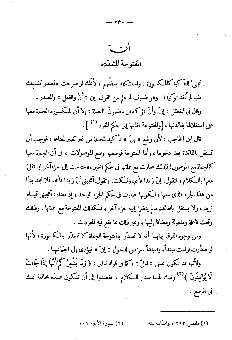 يجيء لِلتَّأْكِيدِ كَالْمَكْسُورَةِ وَاسْتَشْكَلَهُ بَعْضُهُمْ لِأَنَّكَ لَوْ صَرَّحْتَ بِالْمَصْدَرِ الْمُنْسَبِكِ مِنْهَا لَمْ تُفِدْ تَوْكِيدًا وَهُوَ ضَعِيفٌ لِمَا عُلِمَ مِنَ الْفَرْقِ بَيْنَ أَنَّ والفعل والمصدر