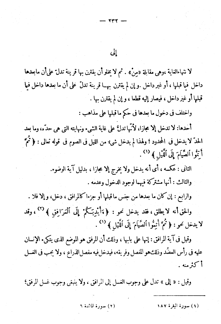 لانتهاء الغاية وهي مقابلة مِنْ ثُمَّ لَا يَخْلُوا أَنْ يَقْتَرِنَ بِهَا قَرِينَةٌ تَدُلُّ عَلَى أَنَّ مَا بَعْدَهَا دَاخِلٌ فِيمَا قَبْلَهَا أَوْ غَيْرُ دَاخِلٍ وَإِنْ لَمْ يقترن بها قرينة تدل على أن ما بَعْدَهَا دَاخِلٌ فِيمَا قَبْلَهَا أَوْ غَيْرُ دَاخِلٍ فَيُصَارُ إِلَيْهِ قَطْعًا وَإِنْ لَمْ يَقْتَرِنْ بِهَا
