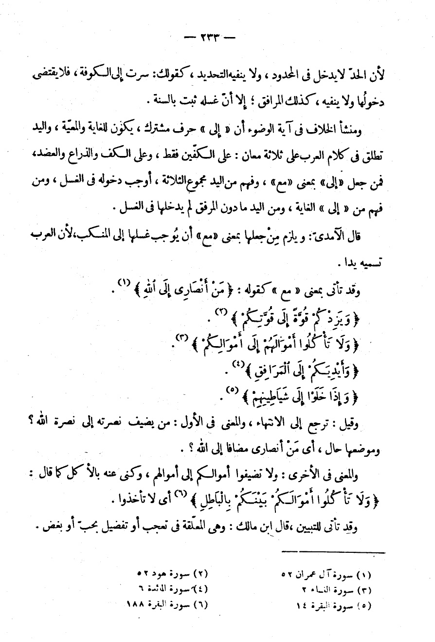 وَمَنْشَأُ الْخِلَافِ فِي آيَةِ الْوُضُوءِ أَنَّ إِلَى حَرْفٌ مُشْتَرَكٌ يَكُونُ لِلْغَايَةِ وَالْمَعِيَّةِ وَالْيَدُ تُطْلَقُ فِي كَلَامِ الْعَرَبِ عَلَى ثَلَاثَةِ مَعَانٍ عَلَى الْكَفَّيْنِ فَقَطْ وَعَلَى الْكَفِّ وَالذِّرَاعِ وَالْعَضُدِ فَمَنْ جَعَلَ إِلَى بِمَعْنَى مَعَ وَفَهِمَ مِنَ الْيَدِ مَجْمُوعَ الثَّلَاثَةِ أَوْجَبَ دُخُولَهُ فِي الْغَسْلِ وَمَنْ فَهِمَ مِنْ إِلَى الْغَايَةَ وَمِنَ الْيَدِ مَا دُونَ الْمِرْفَقِ لَمْ يُدْخِلْهَا فِي الْغَسْلِ