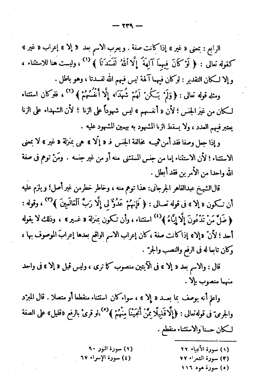 قَالَ: الشَّيْخُ عَبْدُ الْقَاهِرِ الْجُرْجَانِيُّ: هَذَا تَوَهُّمٌ مِنْهُ وَخَاطِرٌ خَطَرَ مِنْ غَيْرِ أَصْلٍ وَيَلْزَمُ عَلَيْهِ أَنْ تَكُونَ إِلَّا فِي قَوْلِهِ تَعَالَى: {فَإِنَّهُمْ عَدُوٌّ لِي إِلَّا رَبَّ العالمين} وقوله: ضل من تدعون إلا إياه اسْتِثْنَاءً وَأَنْ تَكُونَ بِمَنْزِلَةِ غَيْرَ وَذَلِكَ لَا يَقُولُهُ أَحَدٌ لِأَنَّ إِلَّا إِذَا كَانَتْ صِفَةً كَانَ إِعْرَابُ الِاسْمِ الْوَاقِعِ بَعْدَهَا إِعْرَابَ الْمَوْصُوفِ بِهَا وَكَانَ تَابِعًا لَهُ فِي الرَّفْعِ وَالنَّصْبِ والجر