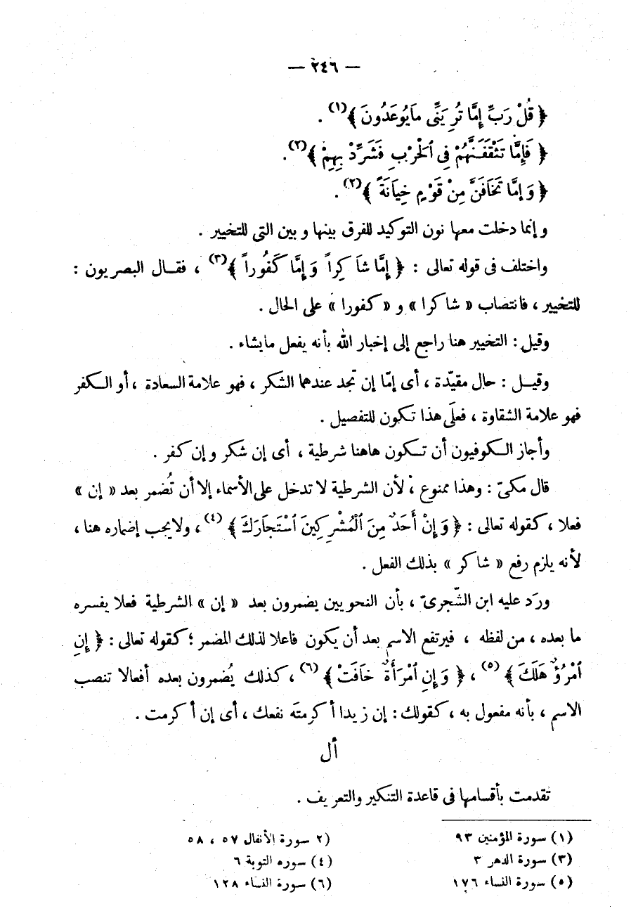 وَاخْتُلِفَ فِي قَوْلِهِ تَعَالَى: {إما شاكرا وإما كفورا} فقال البصريون للتخيير فانتصاب شاكرا وكفورا عَلَى الْحَالِ