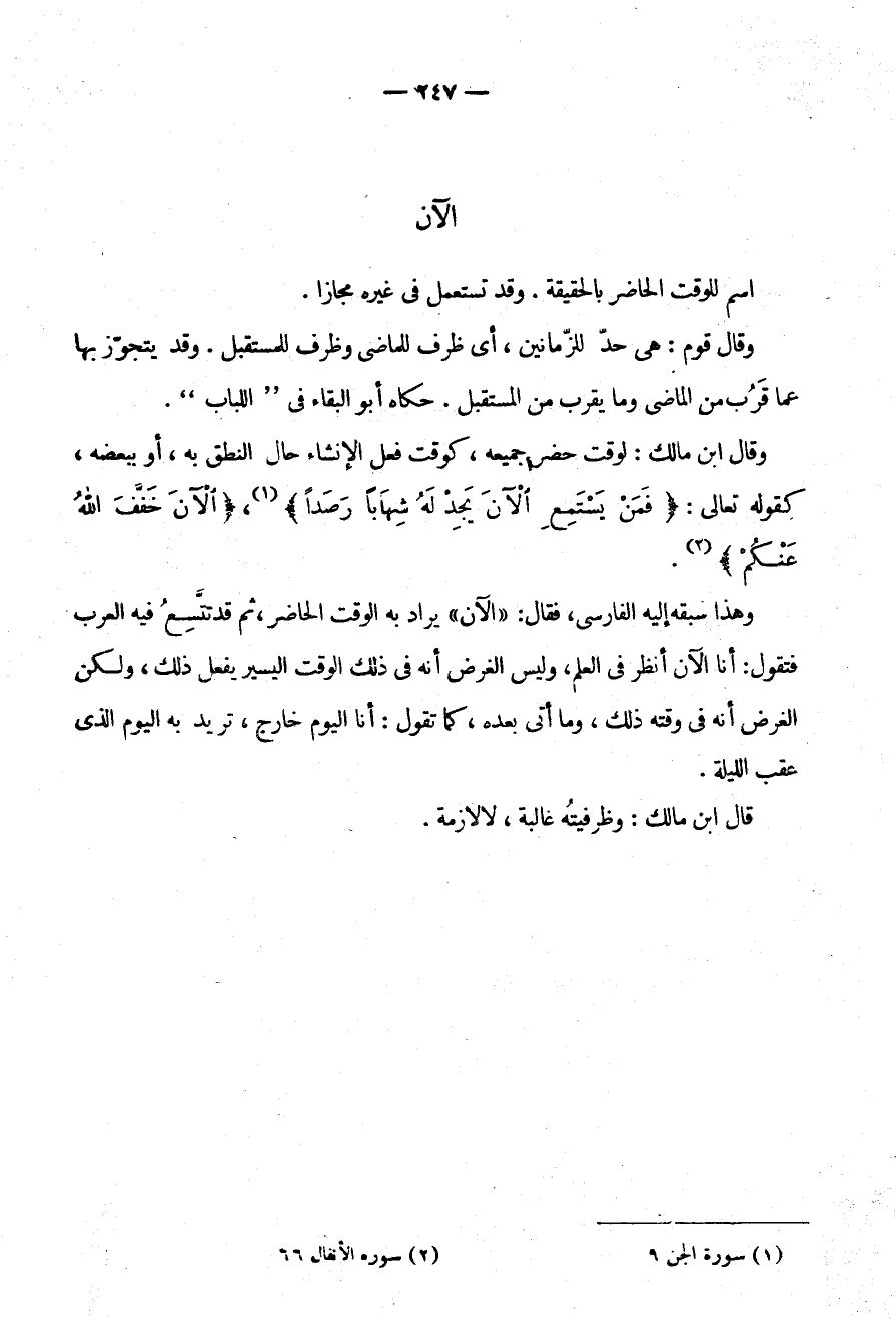 وَقَالَ ابْنُ مَالِكٍ لِوَقْتٍ حَضَرَ جَمِيعُهُ كَوَقْتِ فِعْلِ الْإِنْشَاءِ حَالَ النُّطْقِ بِهِ أَوْ ببعضه بقوله تَعَالَى: {فَمَنْ يَسْتَمِعِ الْآنَ يَجِدْ لَهُ شِهَابًا رصدا} {الآن خفف الله عنكم}