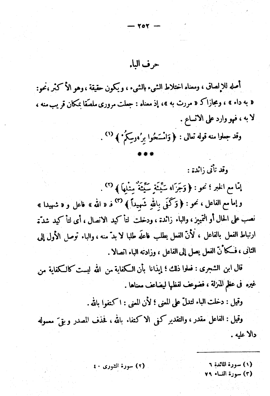 وَإِمَّا مَعَ الْفَاعِلِ نَحْوُ: {وَكَفَى بِاللَّهِ شَهِيدًا} فـ "الله" فاعل وشهيدا نُصِبَ عَلَى الْحَالِ أَوِ التَّمْيِيزِ وَالْبَاءُ زَائِدَةٌ وَدَخَلَتْ لِتَأْكِيدِ الِاتِّصَالِ أَيْ لِتَأْكِيدِ شِدَّةِ ارْتِبَاطِ الْفِعْلِ بِالْفَاعِلِ لِأَنَّ الْفِعْلَ يَطْلُبُ فَاعِلَهُ طَلَبًا لَا بُدَّ مِنْهُ وَالْبَاءُ تُوَصِّلُ الْأَوَّلَ إِلَى الثَّانِي فَكَأَنَّ الْفِعْلَ يَصِلُ إِلَى الْفَاعِلِ وَزَادَتْهُ الْبَاءُ اتِّصَالًا