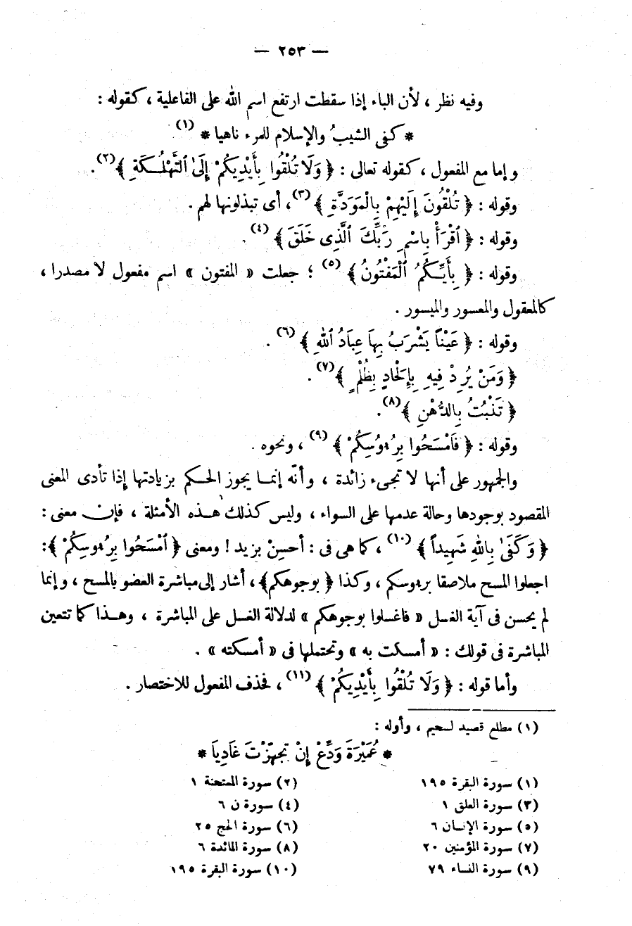 وَالْجُمْهُورُ عَلَى أَنَّهَا لَا تَجِيءُ زَائِدَةً وَأَنَّهُ إِنَّمَا يَجُوزُ الْحُكْمُ بِزِيَادَتِهَا إِذَا تَأَدَّى الْمَعْنَى الْمَقْصُودُ بِوُجُودِهَا وَحَالَةِ عَدَمِهَا عَلَى السَّوَاءِ وَلَيْسَ كَذَلِكَ هَذِهِ الْأَمْثِلَةُ فَإِنَّ مَعْنَى: {وَكَفَى بالله شهيدا} ،كما هي في أحسن بزيد ومعنى: {وامسحوا برؤوسكم} اجعلوا المسح ملاصقا برؤسكم وَكَذَا {بِوُجُوهِكُمْ} أَشَارَ إِلَى مُبَاشَرَةِ الْعُضْوِ بِالْمَسْحِ وَإِنَّمَا لَمْ يَحْسُنْ فِي آيَةِ الْغُسْلِ فَاغْسِلُوا بِوُجُوهِكُمْ لِدَلَالَةِ الْغَسْلِ عَلَى الْمُبَاشَرَةِ وَهَذَا كَمَا تَتَعَيَّنُ الْمُبَاشَرَةُ فِي قَوْلِكَ أَمْسَكْتُ بِهِ وَتَحْتَمِلُهَا فِي أَمْسَكْتُهُ