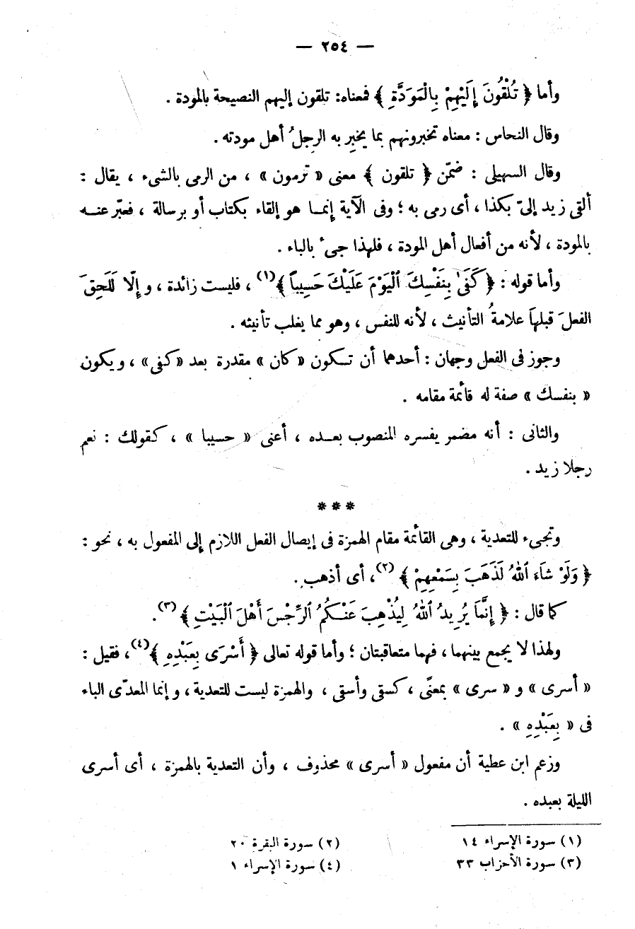 وَلِهَذَا لَا يُجْمَعُ بَيْنَهُمَا فَهُمَا مُتَعَاقِبَتَانِ وَأَمَّا قوله تعالى: {أسرى بعبده} فَقِيلَ: أَسْرَى وَسَرَى بِمَعْنًى كَسَقَى وَأَسْقَى وَالْهَمْزَةُ لَيْسَتْ لِلتَّعْدِيَةِ وَإِنَّمَا الْمُعَدَّى الْبَاءُ فِي بِعَبْدِهِ