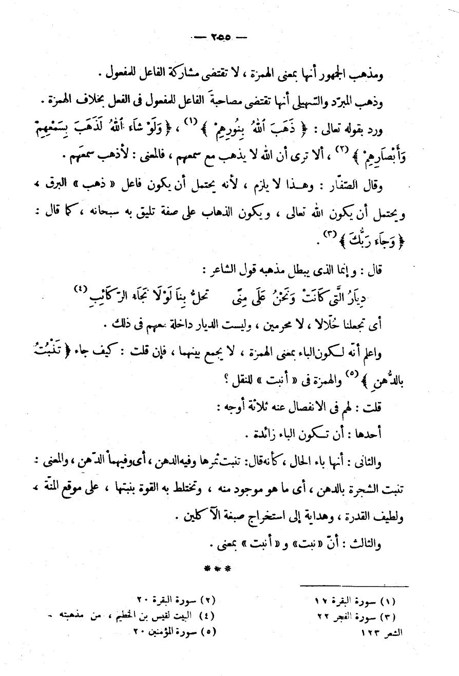 وَاعْلَمْ أَنَّهُ لِكَوْنِ الْبَاءِ بِمَعْنَى الْهَمْزَةِ لَا يُجْمَعُ بَيْنَهُمَا فإن قلت: كيف جاء: {تنبت بالدهن} وَالْهَمْزَةُ فِي أَنْبَتَ لِلنَّقْلِ؟