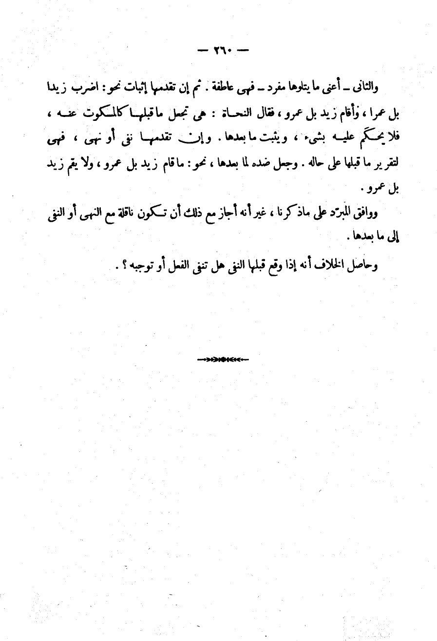 وَالثَّانِي -أَعْنِي مَا يَتْلُوهَا مُفْرَدٌ- فَهِيَ عَاطِفَةٌ ثُمَّ إِنْ تَقَدَّمَهَا إِثْبَاتٌ نَحْوُ اضْرِبْ زَيْدًا بَلْ عَمْرًا وَأَقَامَ زَيْدٌ بَلْ عَمْرٌو فَقَالَ النُّحَاةُ هِيَ تَجْعَلُ مَا قَبْلَهَا كَالْمَسْكُوتِ عَنْهُ فَلَا يُحْكَمُ عَلَيْهِ بِشَيْءٍ وَيُثْبَتُ مَا بَعْدَهَا وَإِنْ تَقَدَّمَهَا نَفْيٌ أَوْ نَهْيٌ فَهِيَ لِتَقْرِيرِ مَا قَبْلَهَا عَلَى حَالِهِ وَجَعْلِ ضِدِّهِ لِمَا بَعْدَهَا نَحْوُ مَا قَامَ زَيْدٌ بَلْ عَمْرٌو وَلَا يَقُمْ زَيْدٌ بَلْ عَمْرٌو