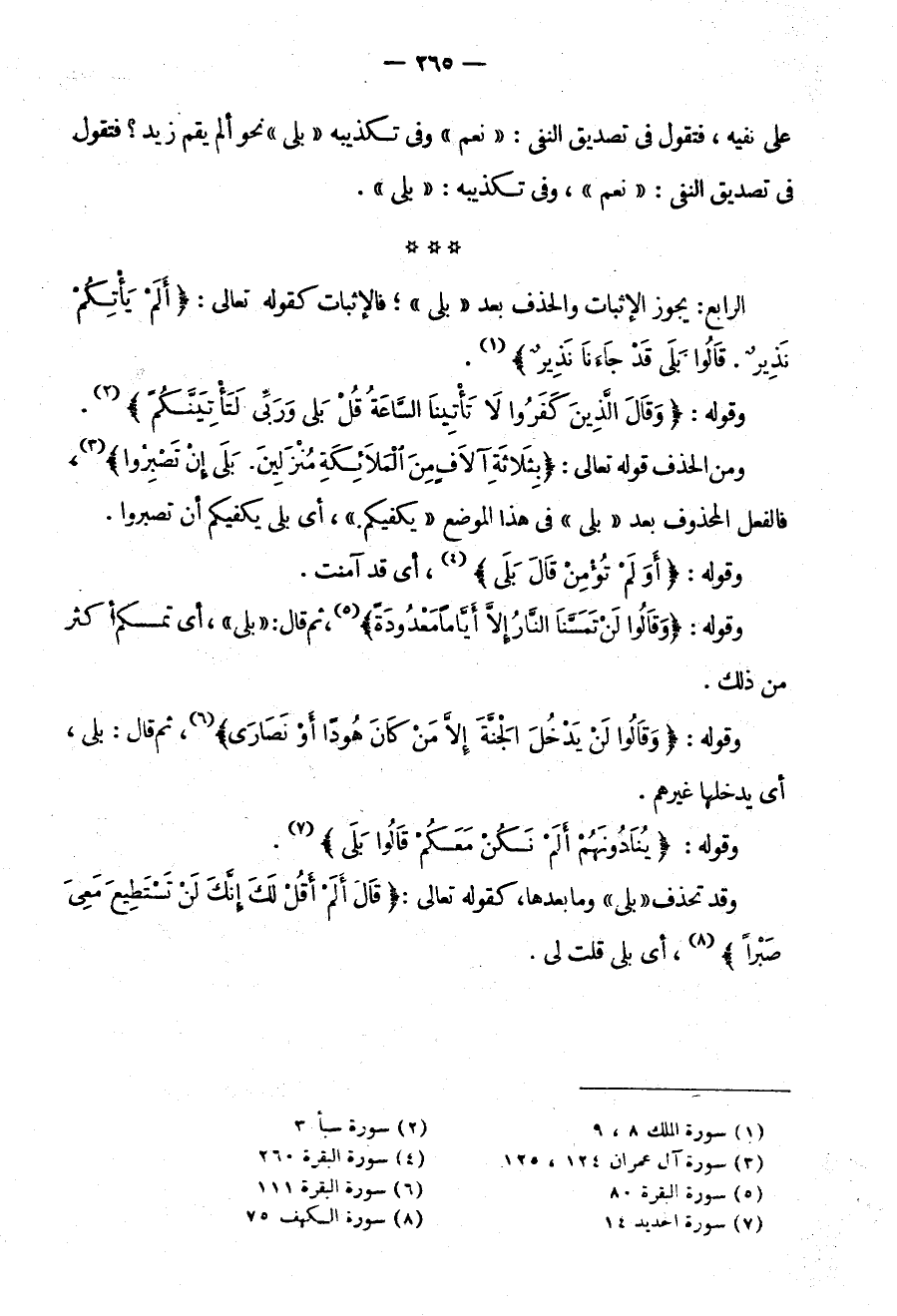 الرابع: يَجُوزُ الْإِثْبَاتُ وَالْحَذْفُ بَعْدَ بَلَى فَالْإِثْبَاتُ كَقَوْلِهِ تَعَالَى: {أَلَمْ يَأْتِكُمْ نَذِيرٌ قَالُوا بَلَى قَدْ جاءنا نذير}