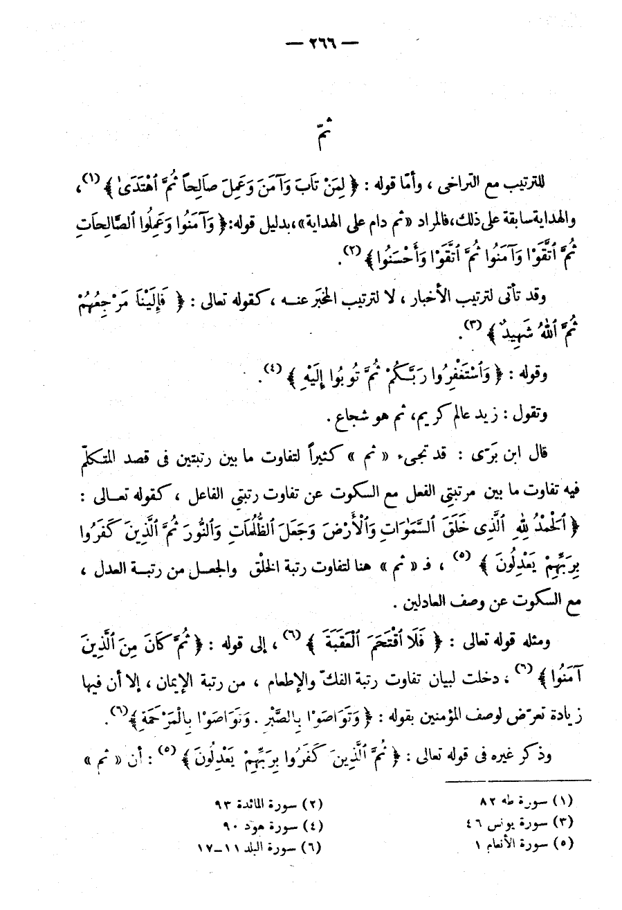 قَالَ ابْنُ بَرِّيٍّ: قَدْ تَجِيءُ ثُمَّ كَثِيرًا لِتَفَاوُتِ مَا بَيْنَ رُتْبَتَيْنِ فِي قَصْدِ الْمُتَكَلِّمِ فِيهِ تَفَاوُتُ مَا بَيْنَ مَرْتَبَتَيِ الْفِعْلِ مَعَ السُّكُوتِ عَنْ تَفَاوُتِ رُتْبَتَيِ الْفَاعِلِ كَقَوْلِهِ تَعَالَى: {الْحَمْدُ لِلَّهِ الَّذِي خَلَقَ السَّمَاوَاتِ وَالْأَرْضَ وَجَعَلَ الظُّلُمَاتِ وَالنُّورَ ثُمَّ الَّذِينَ كَفَرُوا بِرَبِّهِمْ يَعْدِلُونَ} فـ "ثم" هُنَا لِتَفَاوُتِ رُتْبَةِ الْخَلْقِ وَالْجَعْلِ مِنْ رُتْبَةِ الْعَدْلِ مَعَ السُّكُوتِ عَنْ وَصْفِ الْعَادِلِينَ