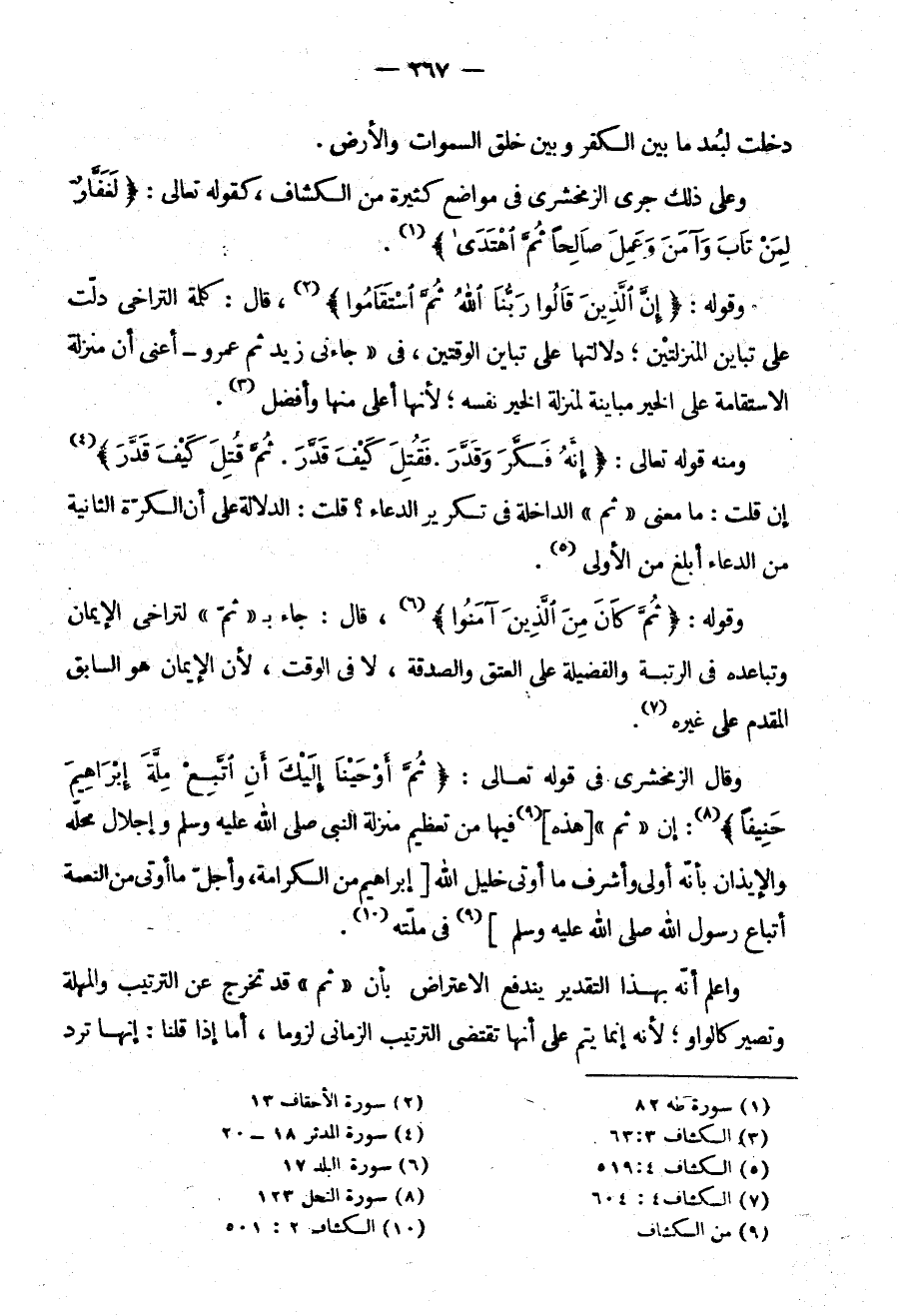 وَعَلَى ذَلِكَ جَرَى الزَّمَخْشَرِيُّ فِي مَوَاضِعَ كَثِيرَةٍ مِنَ الْكَشَّافِ كَقَوْلِهِ تَعَالَى: {لَغَفَّارٌ لِمَنْ تاب وآمن وعمل صالحا ثم اهتدى}