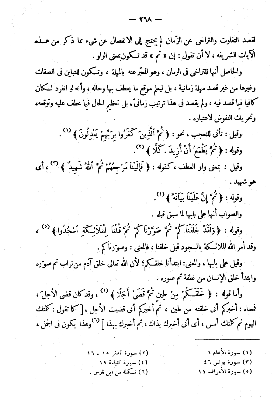 لِقَصْدِ التَّفَاوُتِ وَالتَّرَاخِي عَنِ الزَّمَانِ لَمْ يُحْتَجْ إِلَى الِانْفِصَالِ عَنْ شَيْءٍ مِمَّا ذُكِرَ مِنْ هَذِهِ الْآيَاتِ الشَّرِيفَةِ لَا أَنْ تَقُولَ إِنَّ ثُمَّ قَدْ تَكُونُ بِمَعْنَى الْوَاوِ