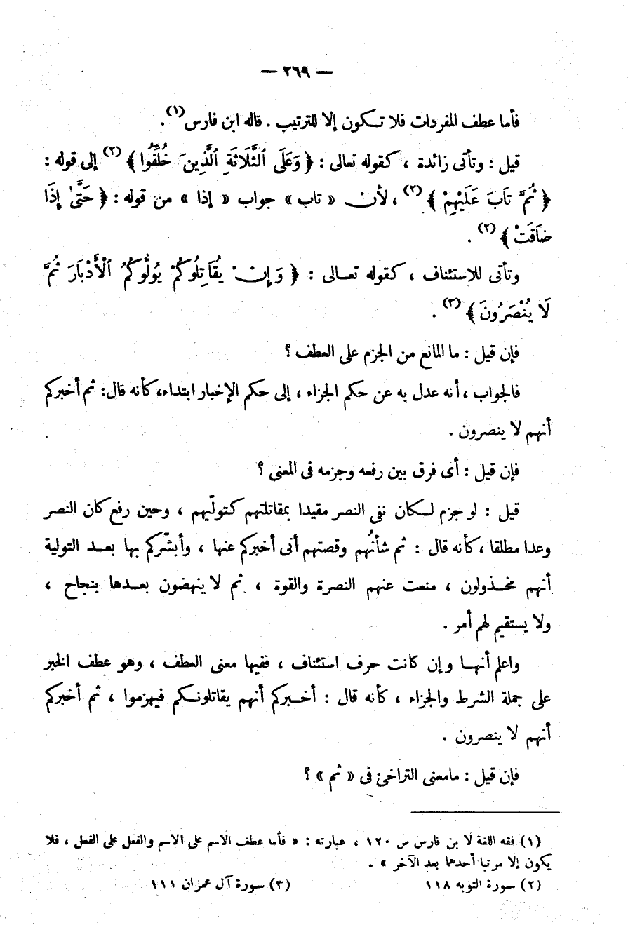 وَاعْلَمْ أَنَّهَا وَإِنْ كَانَتْ حَرْفَ اسْتِئْنَافٍ فَفِيهَا مَعْنَى الْعَطْفِ وَهُوَ عَطْفُ الْخَبَرِ عَلَى جُمْلَةِ الشَّرْطِ وَالْجَزَاءِ كَأَنَّهُ قَالَ أُخْبِرُكُمْ أَنَّهُمْ يُقَاتِلُونَكُمْ فَيُهْزَمُونَ ثُمَّ أُخْبِرُكُمْ أَنَّهُمْ لَا يُنْصَرُونَ