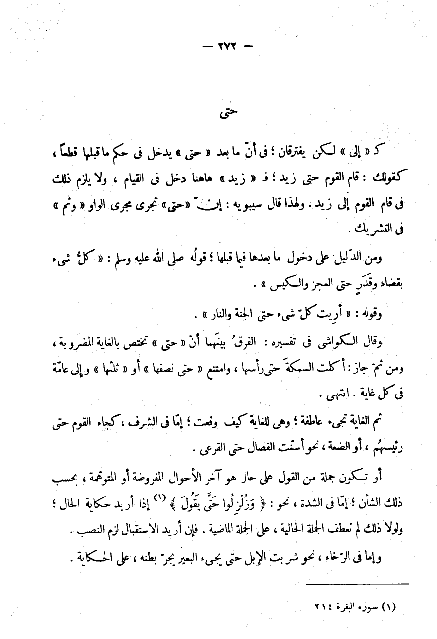 ثُمَّ الْغَايَةُ تَجِيءُ عَاطِفَةً وَهِيَ لِلْغَايَةِ كَيْفَ وَقَعَتْ إِمَّا فِي الشَّرَفِ كَجَاءَ الْقَوْمُ حَتَّى رَئِيسُهُمْ أَوِ الضعة نحو أسنت الْفِصَالُ حَتَّى الْقَرْعَى