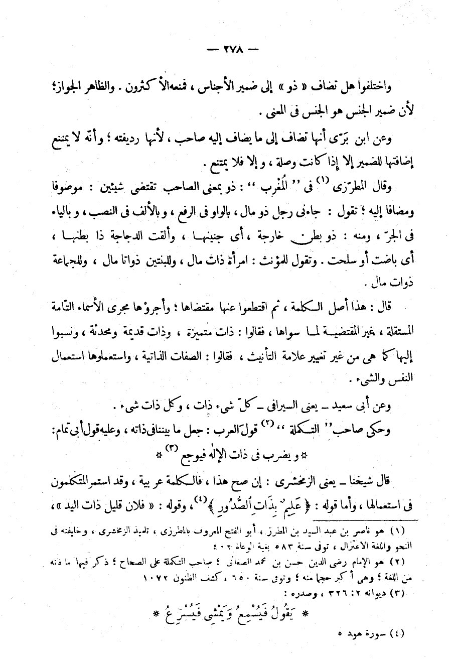 فال شَيْخُنَا يَعْنِي الزَّمَخْشَرِيَّ إِنْ صَحَّ هَذَا فَالْكَلِمَةُ عَرَبِيَّةٌ وَقَدِ اسْتَمَرَّ الْمُتَكَلِّمُونَ فِي اسْتِعْمَالِهَا وَأَمَّا قوله: {عليم بذات الصدور} وَقَوْلِهِ فُلَانٌ قَلِيلُ ذَاتِ الْيَدِ