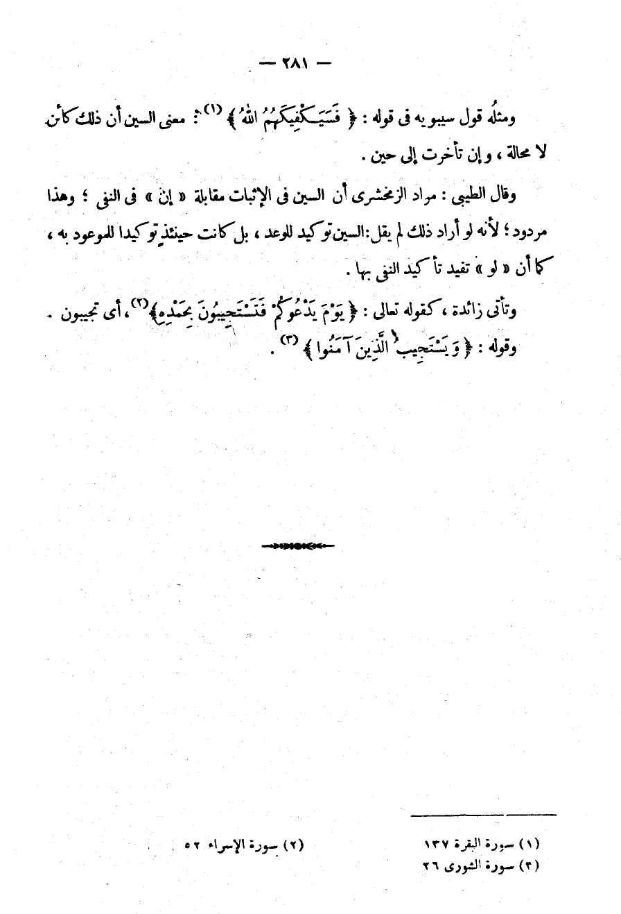 وَقَالَ الطِّيبِيُّ مُرَادُ الزَّمَخْشَرِيِّ أَنَّ السِّينَ فِي الْإِثْبَاتِ مُقَابِلَةُ إِنْ فِي النَّفْيِ وَهَذَا مَرْدُودٌ لِأَنَّهُ لَوْ أَرَادَ ذَلِكَ لَمْ يَقُلْ السِّينُ تَوْكِيدٌ لِلْوَعْدِ بَلْ كَانَتْ حِينَئِذٍ تَوْكِيدًا لِلْمَوْعُودِ بِهِ كَمَا أَنَّ لَوْ تُفِيدُ تَأْكِيدَ النَّفْيِ بِهَا