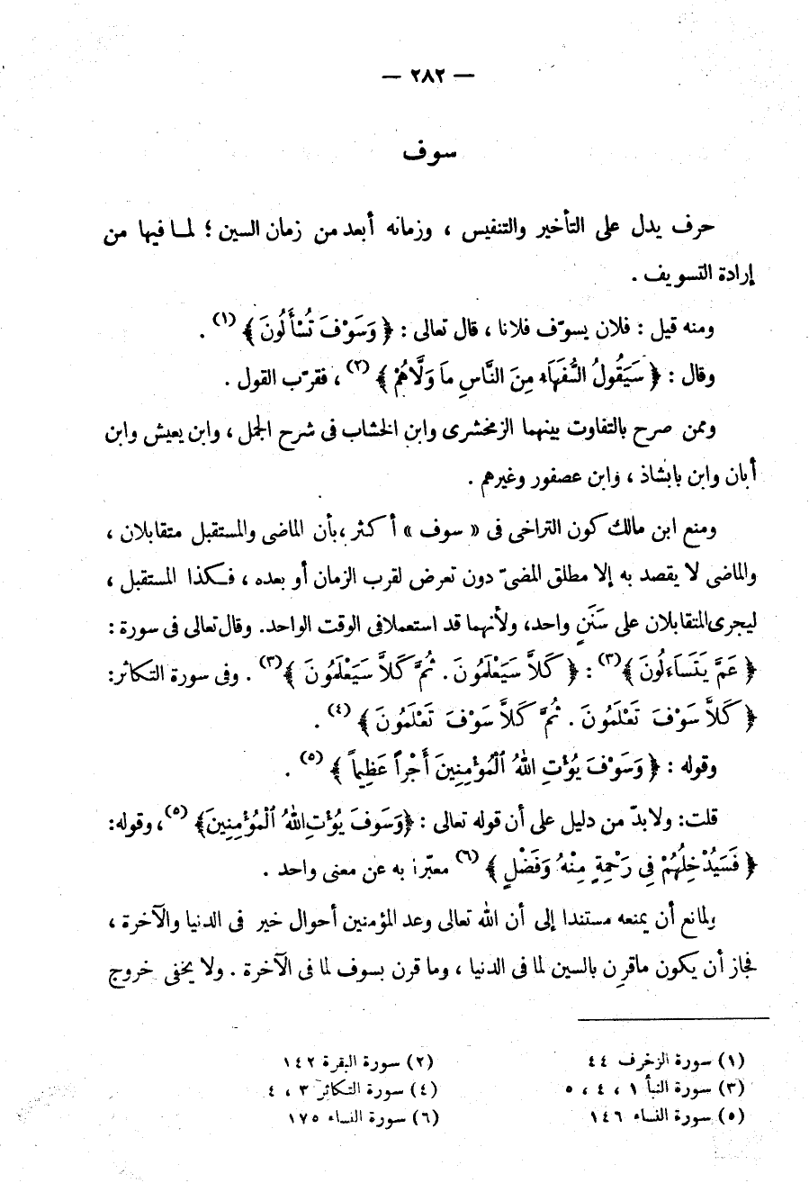 حَرْفٌ يَدُلُّ عَلَى التَّأْخِيرِ وَالتَّنْفِيسِ وَزَمَانُهُ أَبْعَدُ مِنْ زَمَانِ السِّينِ لِمَا فِيهَا مِنْ إِرَادَةِ التَّسْوِيفِ