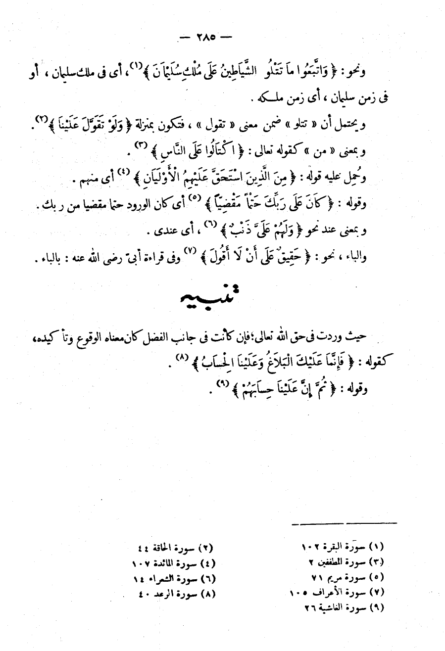ونحو: {واتبعوا ما تتلوا الشياطين على ملك سليمان} أَيْ فِي مُلْكِ سُلَيْمَانَ أَوْ فِي زَمَنِ سليمان أي زمن ملكه