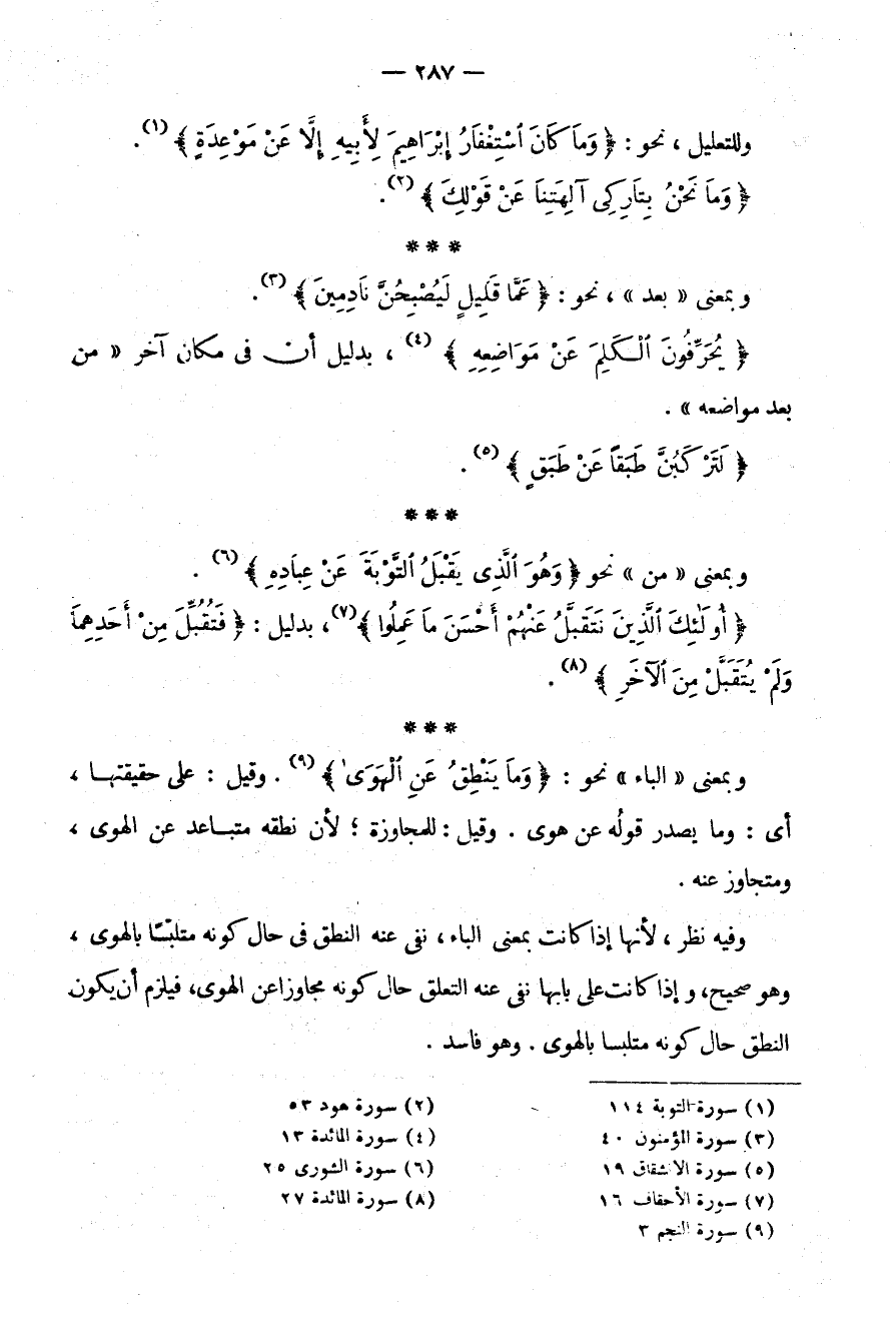 وَبِمَعْنَى الْبَاءِ نَحْوُ: {وَمَا يَنْطِقُ عَنِ الْهَوَى} وَقِيلَ عَلَى حَقِيقَتِهَا أَيْ وَمَا يَصْدُرُ قَوْلُهُ عَنْ هَوًى وَقِيلَ لِلْمُجَاوَزَةِ لِأَنَّ نُطْقَهُ مُتَبَاعِدٌ عن الهوى متجاوز عَنْهُ