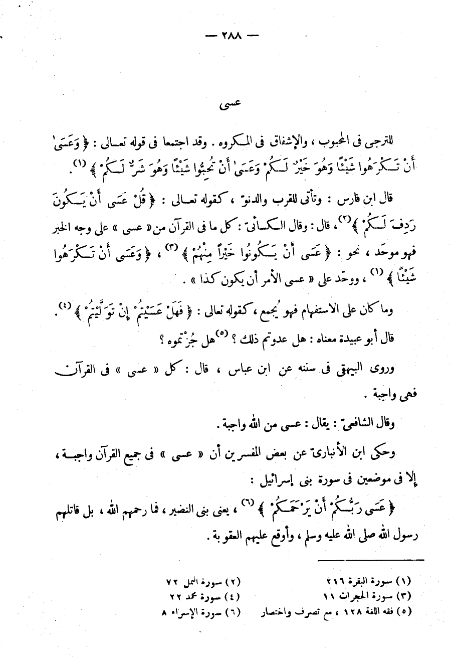 وَحَكَى ابْنُ الْأَنْبَارِيِّ عَنْ بَعْضِ الْمُفَسِّرِينَ أَنَّ عَسَى فِي جَمِيعِ الْقُرْآنِ وَاجِبَةٌ إِلَّا فِي مَوْضِعَيْنِ فِي سُورَةِ بَنِي إِسْرَائِيلَ:
