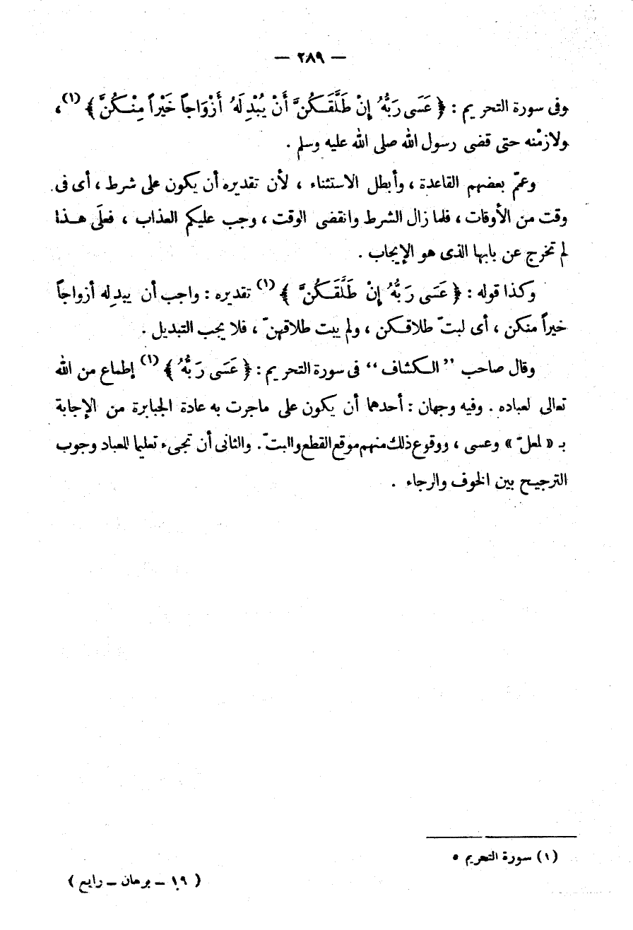 وَقَالَ صَاحِبُ الْكَشَّافِ فِي سُورَةِ التحريم: {عسى ربه} إِطْمَاعٌ مِنَ اللَّهِ تَعَالَى لِعِبَادِهِ وَفِيهِ وَجْهَانِ أَحَدُهُمَا أَنْ يَكُونَ عَلَى مَا جَرَتْ بِهِ عَادَةُ الْجَبَابِرَةِ مِنَ الْإِجَابَةِ بِـ "لَعَلَّ" وَعَسَى وَوُقُوعِ ذَلِكَ مِنْهُمْ مَوْقِعَ الْقَطْعِ وَالْبَتِّ وَالثَّانِي أَنْ تَجِيءَ تَعْلِيمًا لِلْعِبَادِ وُجُوبَ التَّرْجِيحِ بَيْنَ الخوف والرجاء