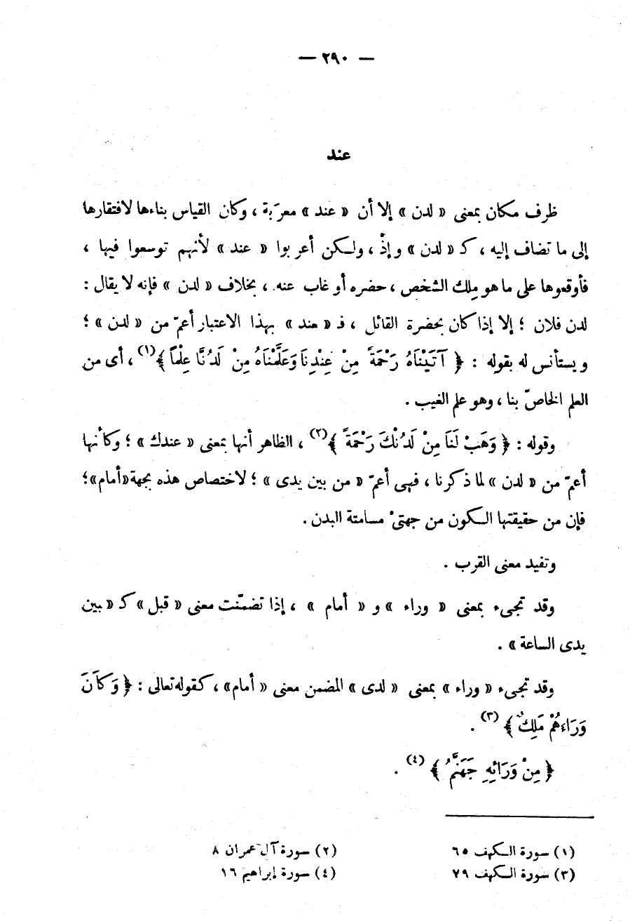 ظَرْفُ مَكَانٍ بِمَعْنَى لَدُنْ إِلَّا أَنَّ عِنْدَ مُعْرَبَةٌ وَكَانَ الْقِيَاسُ بِنَاءَهَا لِافْتِقَارِهَا إِلَى ما تضاف إليه كـ "لدن" وإذ وَلَكِنْ أَعْرَبُوا عِنْدَ لِأَنَّهُمْ تَوَسَّعُوا فِيهَا فَأَوْقَعُوهَا عَلَى مَا هُوَ مِلْكُ الشَّخْصِ حَضَرَهُ أَوْ غَابَ عَنْهُ بِخِلَافِ لَدُنْ فَإِنَّهُ لَا يُقَالُ لَدُنْ فُلَانٍ إِلَّا إِذَا كَانَ بِحَضْرَةِ الْقَائِلِ فَـ "عِنْدَ" بِهَذَا الِاعْتِبَارِ أَعَمُّ مِنْ لَدُنْ وَيُسْتَأْنَسُ لَهُ بِقَوْلِهِ: {آتَيْنَاهُ رَحْمَةً مِنْ عِنْدِنَا وعلمناه من لدنا علما} أَيْ مِنَ الْعِلْمِ الْخَاصِّ بِنَا وَهُوَ عِلْمُ الْغَيْبِ.