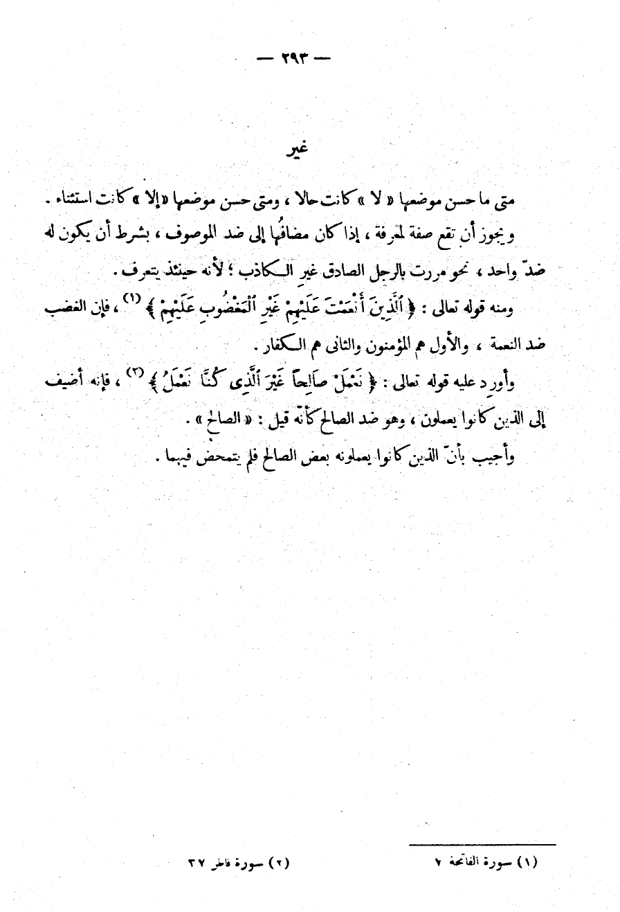وَأُورِدَ عَلَيْهِ قَوْلُهُ تَعَالَى: {نعمل صالحا غير الذي كنا نعمل} فَإِنَّهُ أُضِيفَ إِلَى الَّذِينَ كَانُوا يَعْمَلُونَ وَهُوَ ضِدُّ الصَّالِحِ كَأَنَّهُ قِيلَ الصَّالِحُ