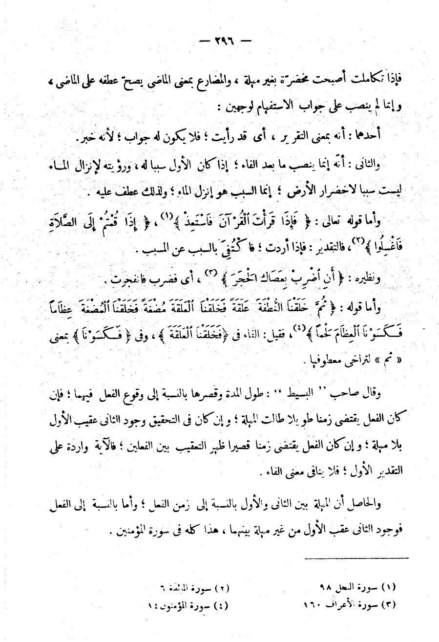 وَالْحَاصِلُ أَنَّ الْمُهْلَةَ بَيْنَ الثَّانِي وَالْأَوَّلِ بِالنِّسْبَةِ إِلَى زَمَنِ الْفِعْلِ وَأَمَّا بِالنِّسْبَةِ إِلَى الْفِعْلِ فَوُجُودُ الثَّانِي عَقِبَ الْأَوَّلِ مِنْ غَيْرِ مُهْلَةٍ بَيْنَهُمَا هَذَا كُلُّهُ فِي سُورَةِ الْمُؤْمِنِينَ