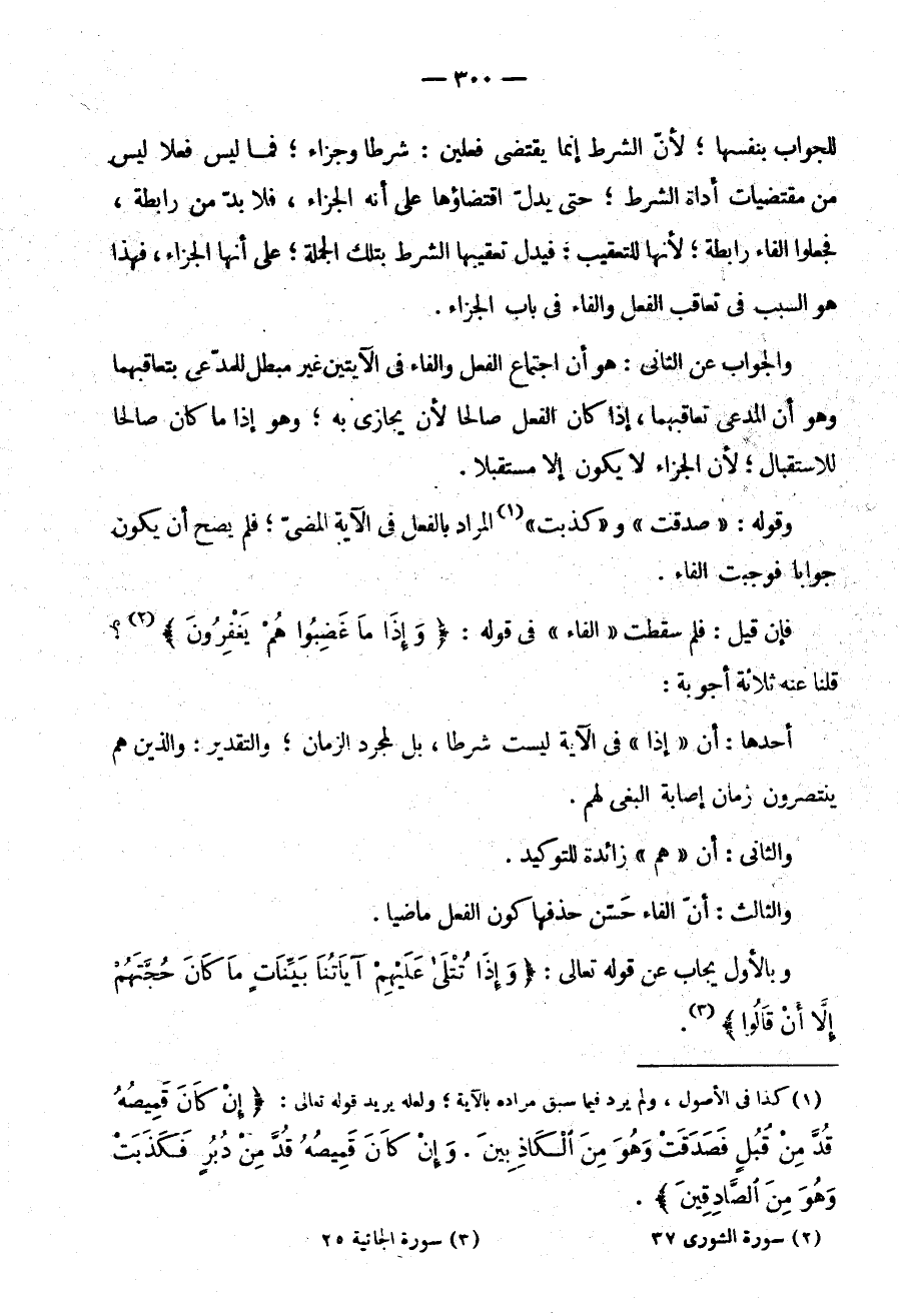 لِلْجَوَابِ بِنَفْسِهَا لِأَنَّ الشَّرْطَ إِنَّمَا يَقْتَضِي فِعْلَيْنِ شَرْطًا وَجَزَاءً فَمَا لَيْسَ فِعْلًا لَيْسَ مِنْ مُقْتَضَيَاتِ أَدَاةِ الشَّرْطِ حَتَّى يَدُلَّ اقْتِضَاؤُهَا عَلَى أَنَّهُ الْجَزَاءُ فَلَا بُدَّ مِنْ رَابِطَةٍ فَجَعَلُوا الْفَاءَ رَابِطَةً لِأَنَّهَا لِلتَّعْقِيبِ فَيَدُلُّ تَعْقِيبُهَا الشَّرْطَ بِتِلْكَ الْجُمْلَةِ عَلَى أَنَّهَا الْجَزَاءُ فَهَذَا هُوَ السَّبَبُ فِي تَعَاقُبِ الْفِعْلِ وَالْفَاءِ فِي بَابِ الْجَزَاءِ