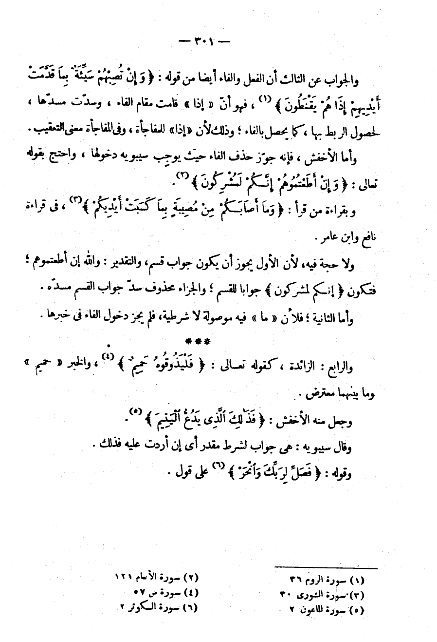 وَلَا حُجَّةَ فِيهِ لِأَنَّ الْأَوَّلَ يَجُوزُ أَنْ يَكُونَ جَوَابَ قَسَمٍ وَالتَّقْدِيرُ وَاللَّهِ إِنْ أَطْعَمْتُمُوهُمْ فَتَكُونُ {إِنَّكُمْ لمشركون} جوابا للقسم ولجزاء مَحْذُوفٌ سَدَّ جَوَابُ الْقِسْمِ مَسَدَّهُ وَأَمَّا الثَّانِيَةُ فَلِأَنَّ مَا فِيهِ مَوْصُولَةٌ لَا شَرْطِيَّةٌ فَلَمْ يَجُزْ دُخُولُ الْفَاءِ فِي خَبَرِهَا.