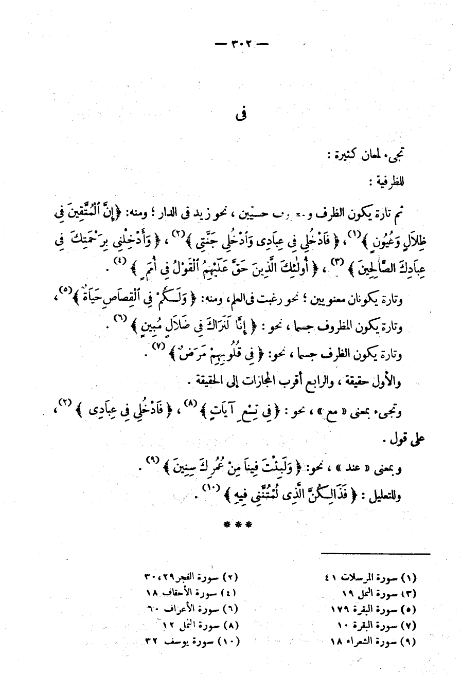 ثُمَّ تَارَةً يَكُونُ الظَّرْفُ وَالْمَظْرُوفُ حِسِّيَّيْنِ نَحْوُ زَيْدٌ فِي الدَّارِ، وَمِنْهُ: {إِنَّ الْمُتَّقِينَ فِي ظِلَالٍ وَعُيُونٍ} ، {فادخلي في عبادي وادخلي جنتي} {وأدخلني برحمتك في عبادك الصالحين} {أُولَئِكَ الَّذِينَ حَقَّ عَلَيْهِمُ الْقَوْلُ فِي أُمَمٍ} وَتَارَةً يَكُونَانِ مَعْنَوِيَّيْنِ نَحْوُ رَغِبْتُ فِي الْعِلْمِ ومنه {ولكم في القصاص حياة} وَتَارَةً يَكُونُ الْمَظْرُوفُ جِسْمًا نَحْوُ {إِنَّا لَنَرَاكَ في ضلال مبين} وَتَارَةً يَكُونُ الظَّرْفُ جِسْمًا نَحْوُ {فِي قُلُوبِهِمْ مرض} وَالْأَوَّلُ حَقِيقَةٌ وَالرَّابِعُ أَقْرَبُ الْمَجَازَاتِ إِلَى الْحَقِيقَةِ.