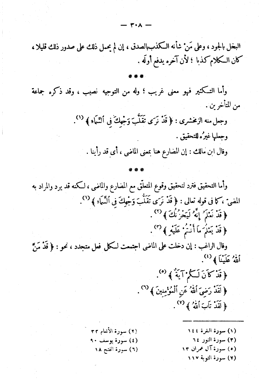 وَأَمَّا التَّحْقِيقُ فَتَرِدُ لِتَحْقِيقِ وُقُوعِ الْمُتَعَلِّقِ مَعَ الْمُضَارِعِ وَالْمَاضِي لَكِنَّهُ قَدْ يَرِدُ وَالْمُرَادُ بِهِ الْمُضِيُّ كَمَا فِي قَوْلِهِ تَعَالَى: {قَدْ نَرَى تَقَلُّبَ وَجْهِكَ فِي السَّمَاءِ}