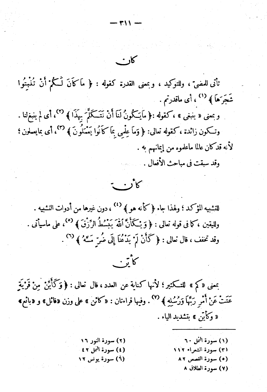 تَأْتِي لِلْمُضِيِّ وَلِلتَّوْكِيدِ وَبِمَعْنَى الْقُدْرَةِ كَقَوْلِهِ: {ما كان لكم أن تنبتوا شجرها} . أي ما قدرتم.