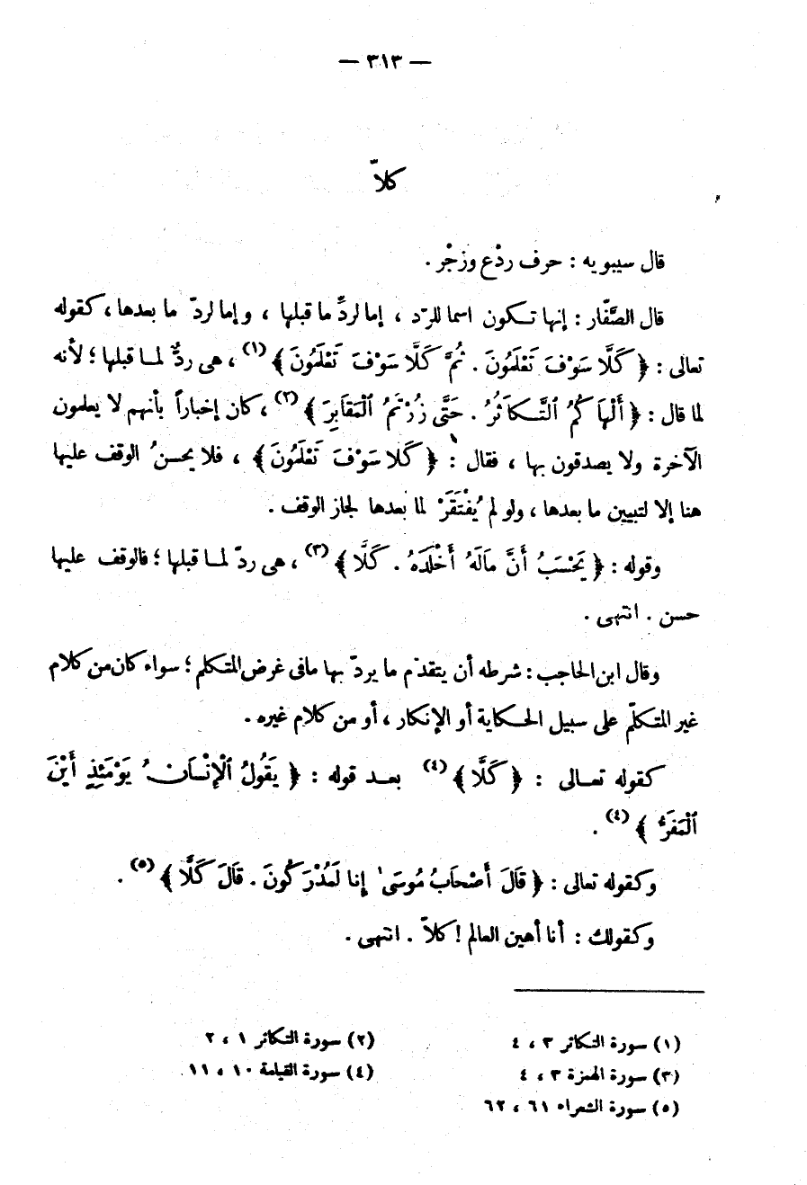قَالَ الصَّفَّارُ إِنَّهَا تَكُونُ اسْمًا لِلرَّدِّ إِمَّا لِرَدِّ مَا قَبْلَهَا وَإِمَّا لِرَدِّ مَا بَعْدَهَا كَقَوْلِهِ تَعَالَى: {كَلَّا سَوْفَ تَعْلَمُونَ ثُمَّ كَلَّا سَوْفَ تَعْلَمُونَ} هِيَ رَدٌّ لِمَا قَبْلَهَا لِأَنَّهُ لَمَّا قَالَ: {ألهاكم التكاثر حتى زرتم المقابر} . كَانَ إِخْبَارًا بِأَنَّهُمْ لَا يَعْلَمُونَ الْآخِرَةَ وَلَا يُصَدِّقُونَ بِهَا فَقَالَ: {كَلَّا سَوْفَ تَعْلَمُونَ} فَلَا يَحْسُنُ الْوَقْفُ عَلَيْهَا هُنَا إِلَّا لِتَبْيِينِ مَا بَعْدَهَا وَلَوْ لَمْ يَفْتَقِرْ لِمَا بَعْدَهَا لَجَازَ الْوَقْفُ.